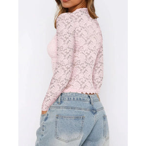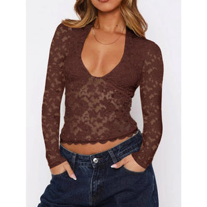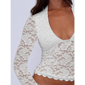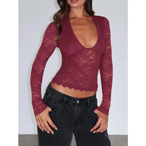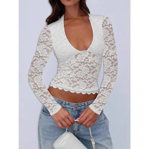 Floral Lace Long Sleeve Deep V-Neck Blouse with Scalloped Hem