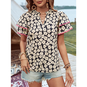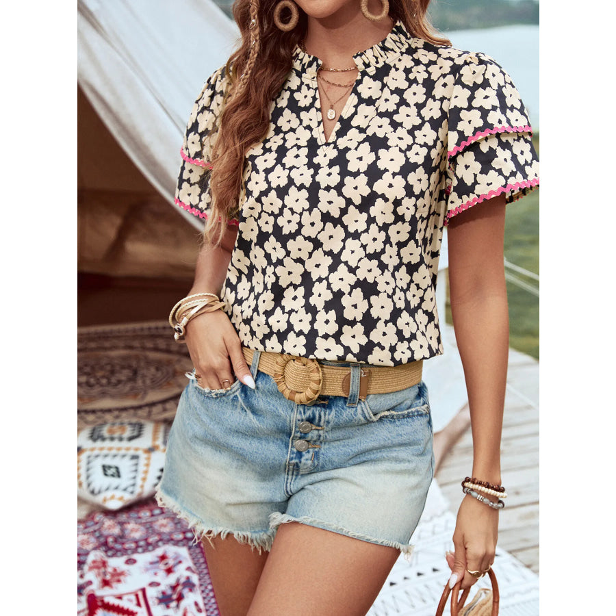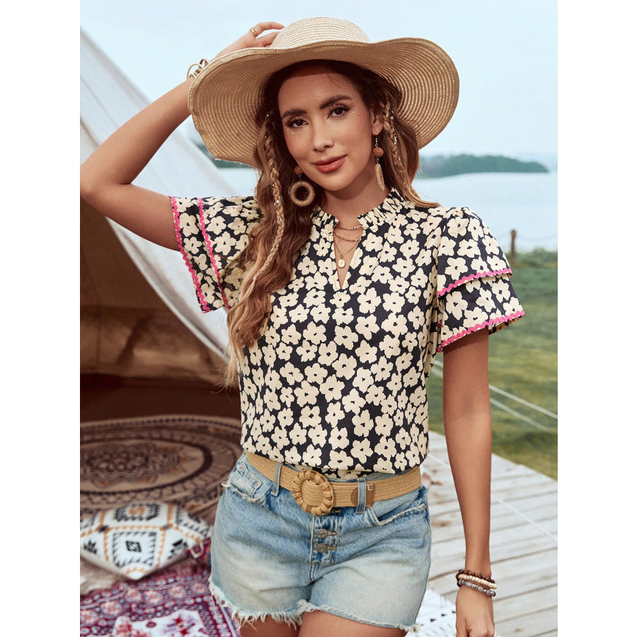 Floral Print Short Sleeve Blouse with Contrast Trim