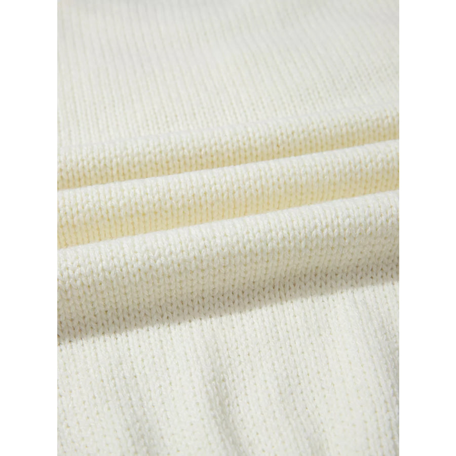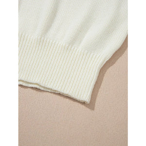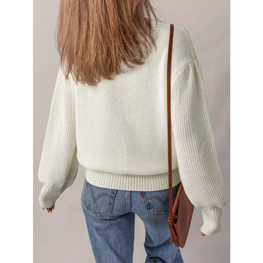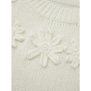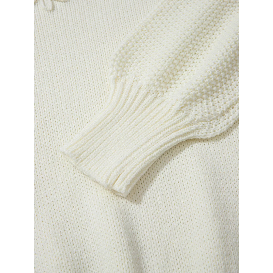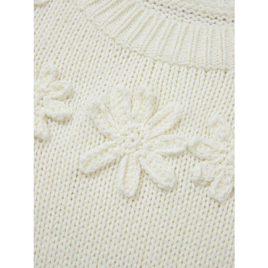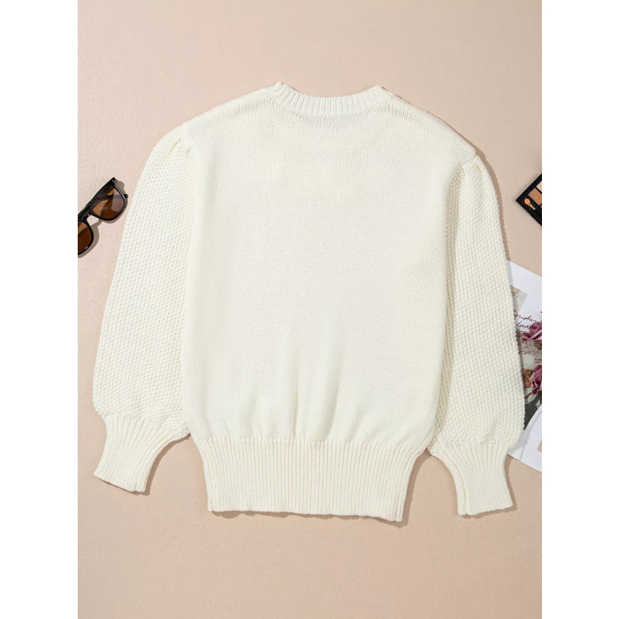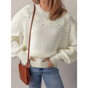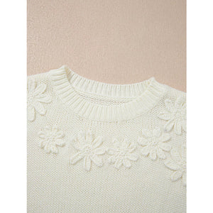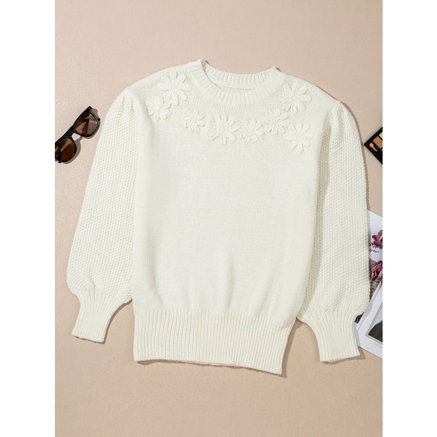 Flower Detail Round Neck Contrast Textured Puff Sleeve Sweater