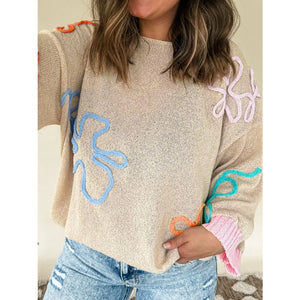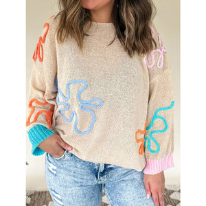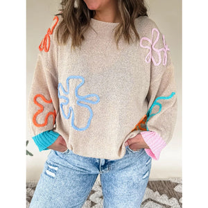 Flower Round Neck Drop Shoulder Sweater