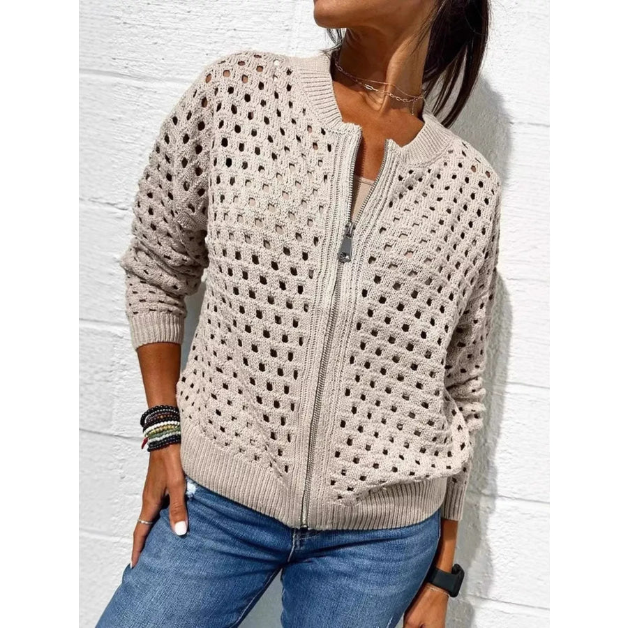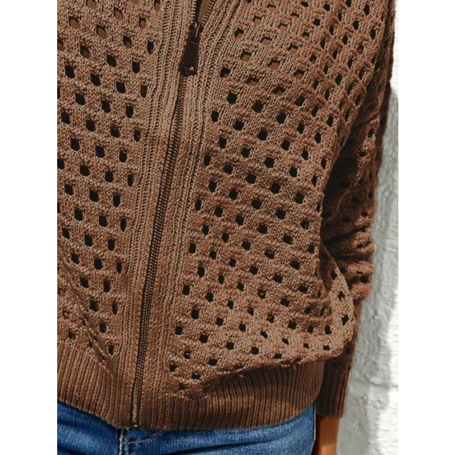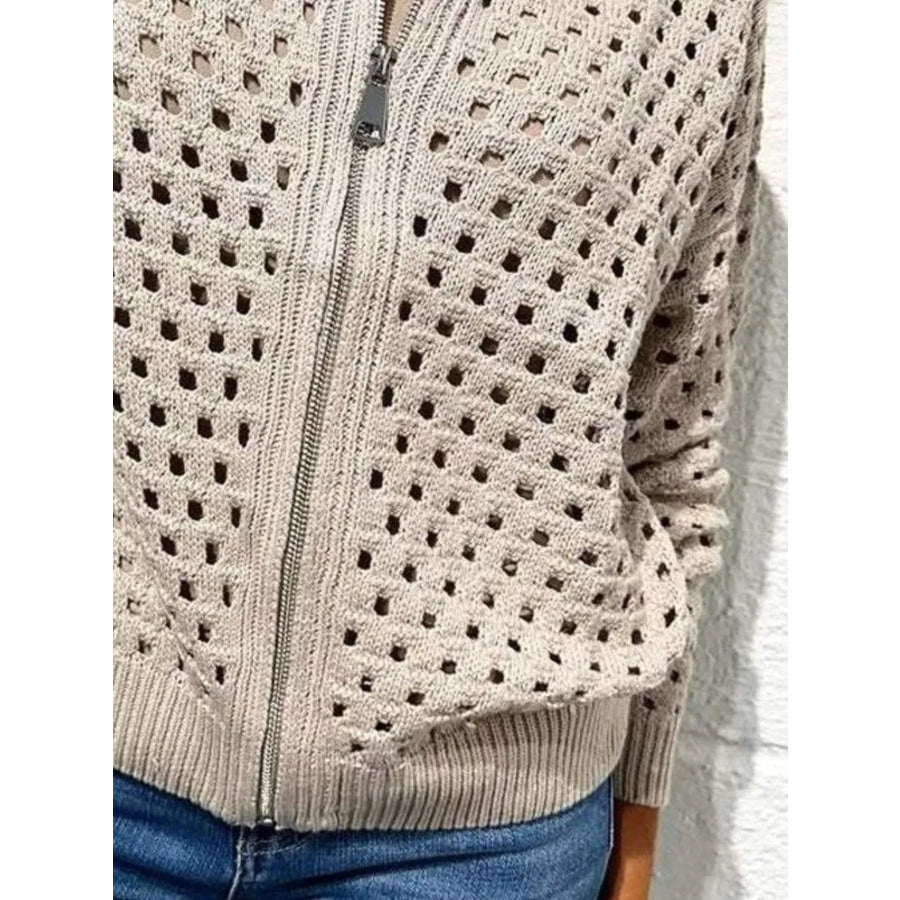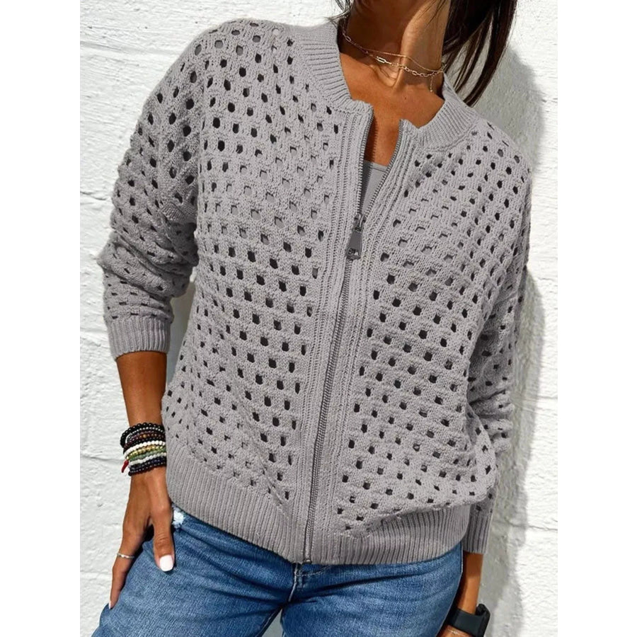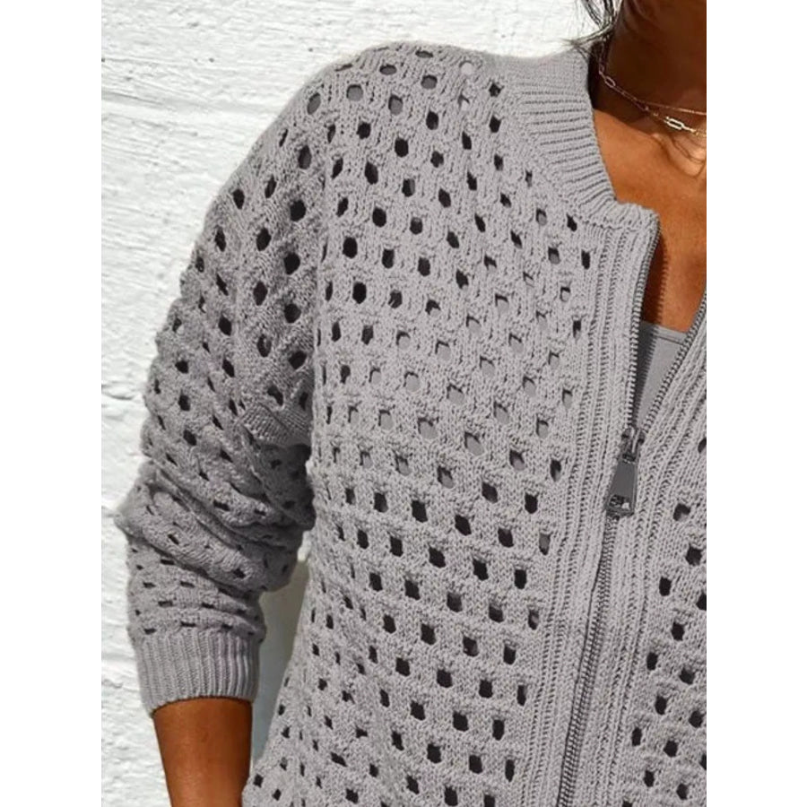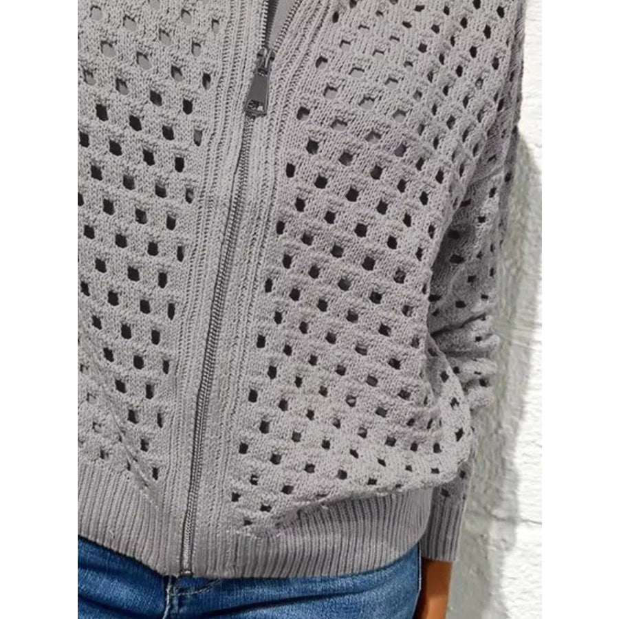 Full Size Zip Up Long Sleeve Cardigan with Eyelet Detail Plus Size