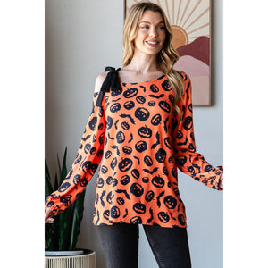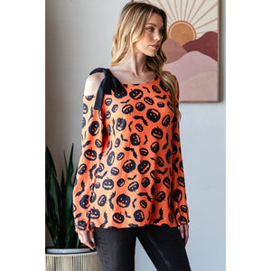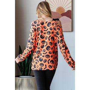 A pumpkin print one-shoulder t-shirt is a fun and whimsical piece that's perfect for the fall season, especially around Halloween. The playful pumpkin print adds a festive touch to the shirt, making it a great choice for themed events or casual gatherings during the autumn months. The one-shoulder design gives a trendy and asymmetrical look, adding a touch of style to the t-shirt. This type of top can be paired with jeans and sneakers for a cute and casual outfit, or dressed up with a skirt and heels for a more dressed-up look. The pumpkin print one-shoulder t-shirt is a unique and eye-catching piece that's sure to be a conversation starter.