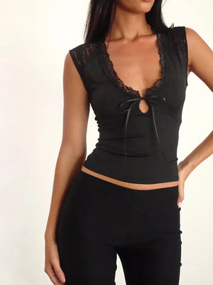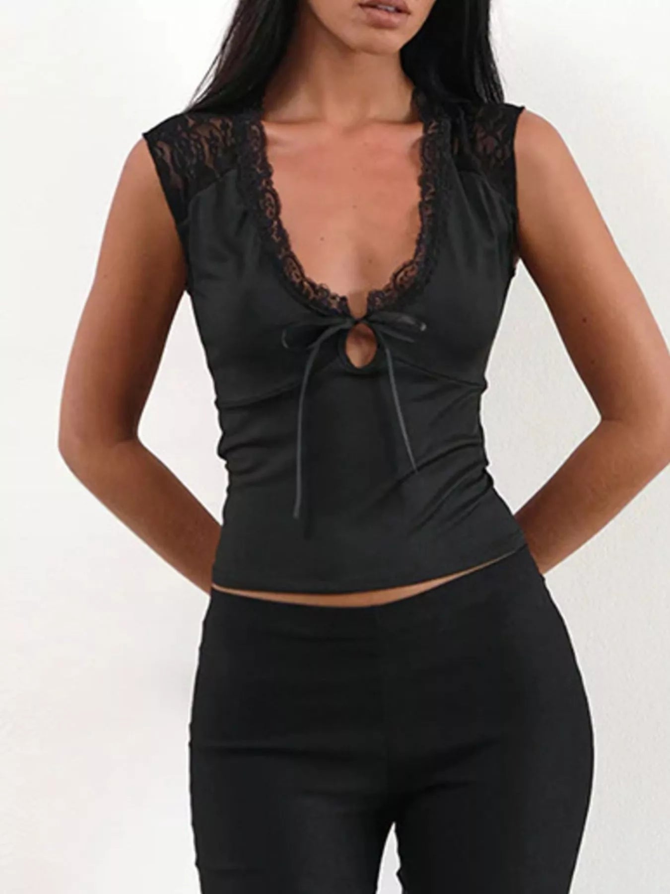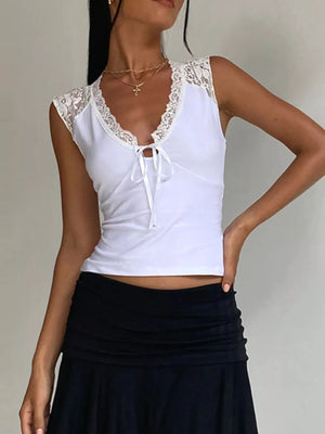 Lace Trim V-Neck Sleeveless Tank Top with Front Tie