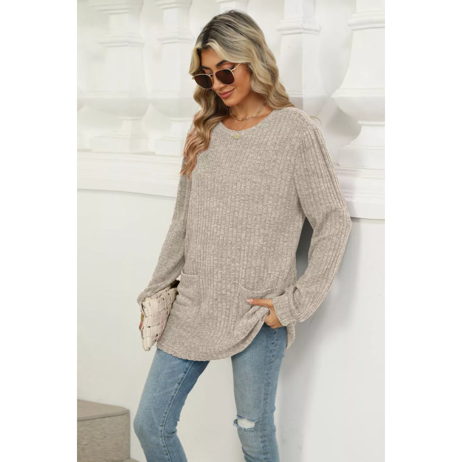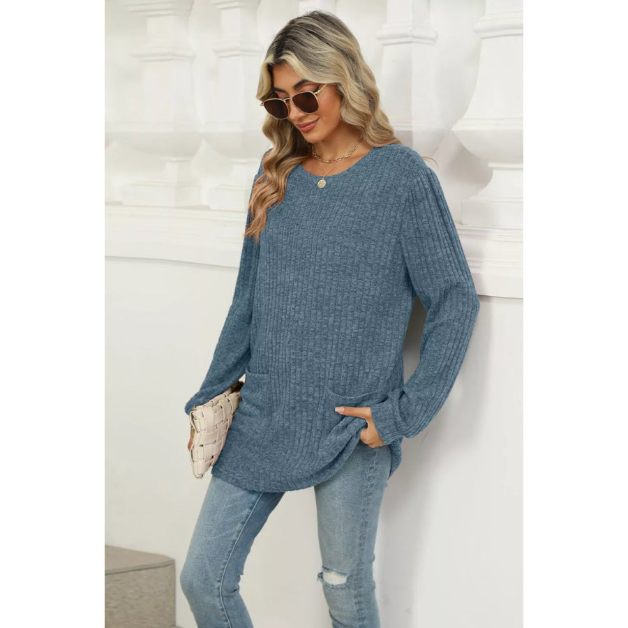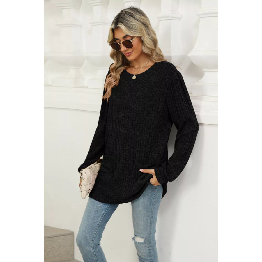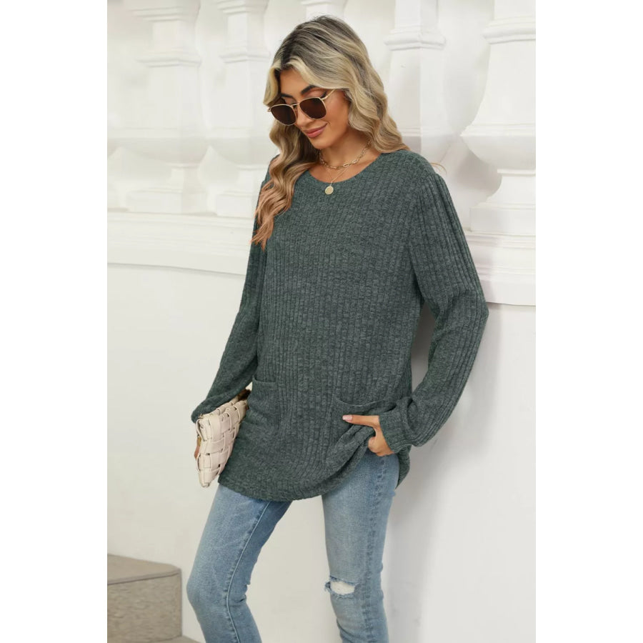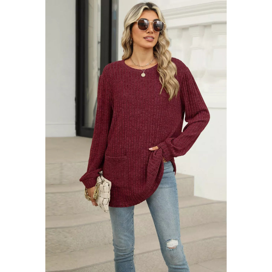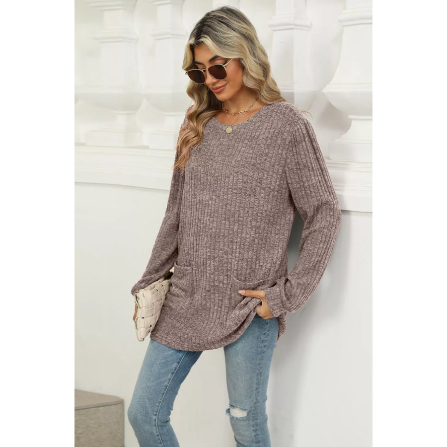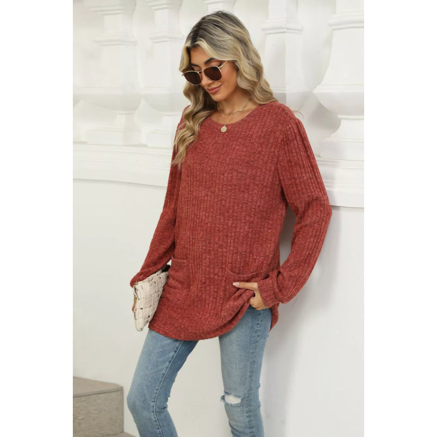 Long Sleeve Ribbed Knit Top with Front Pockets