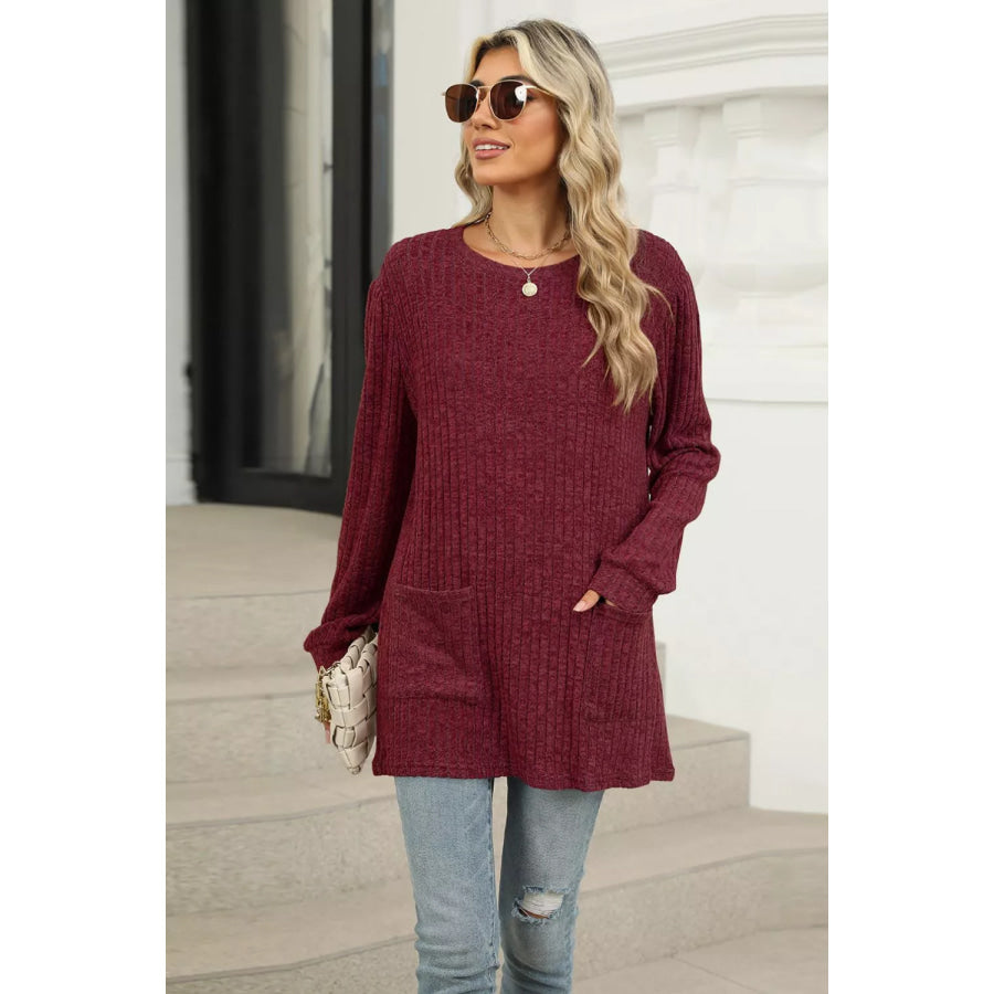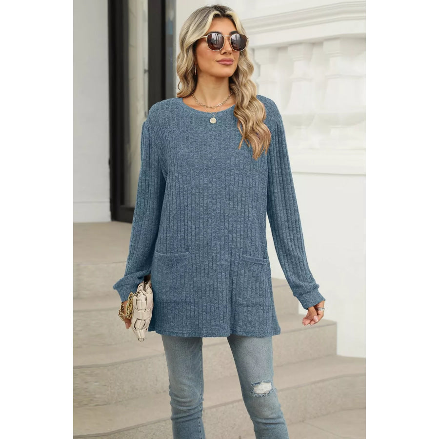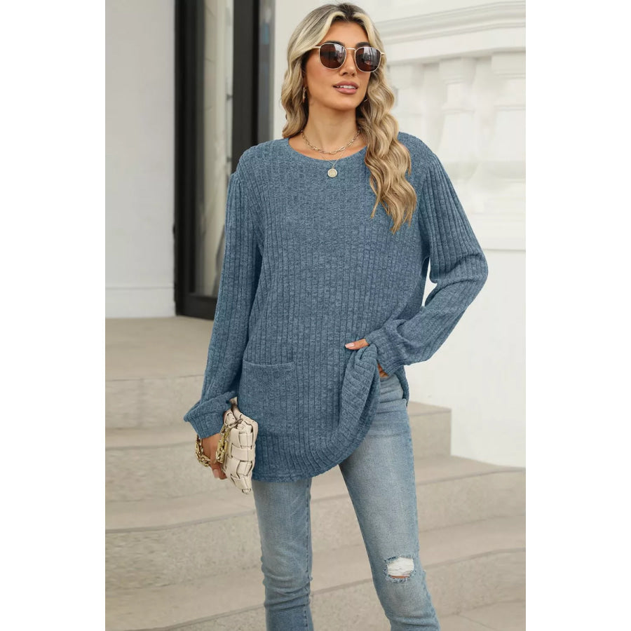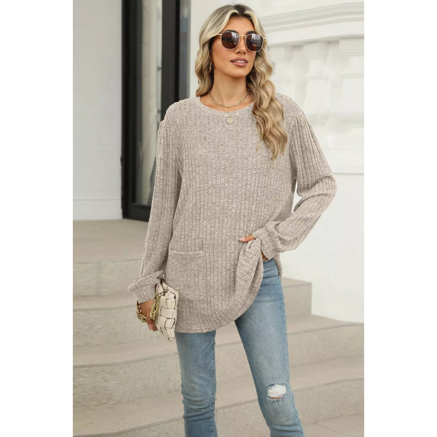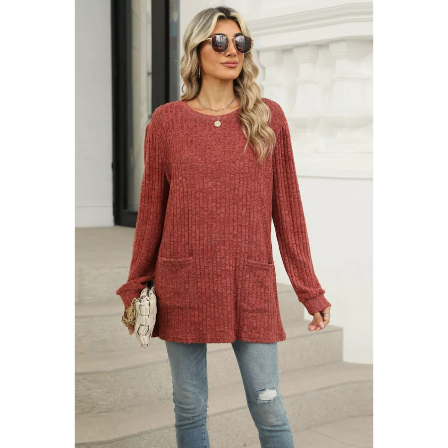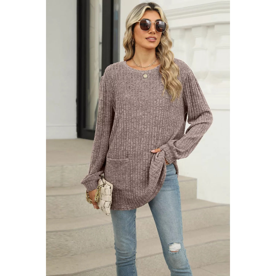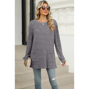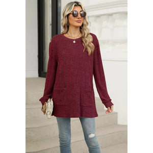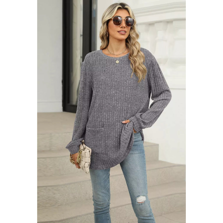 Long Sleeve Ribbed Knit Top with Front Pockets