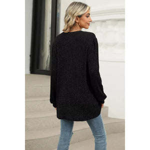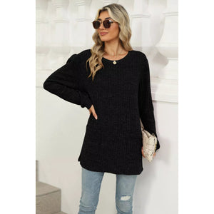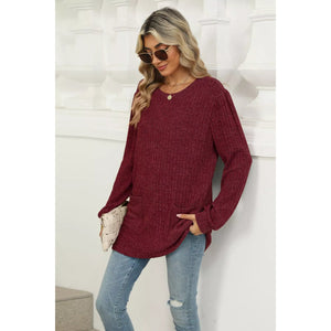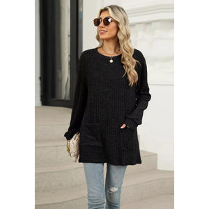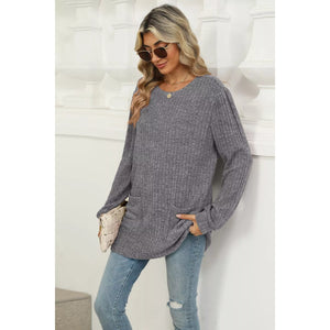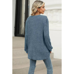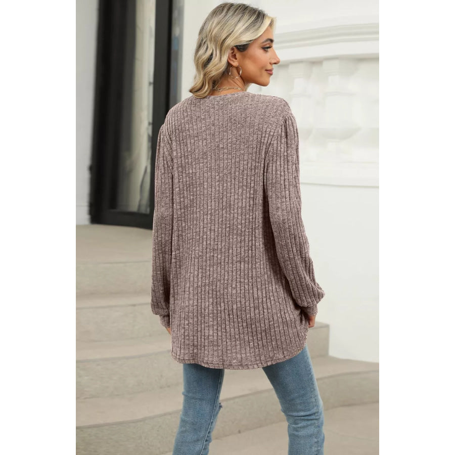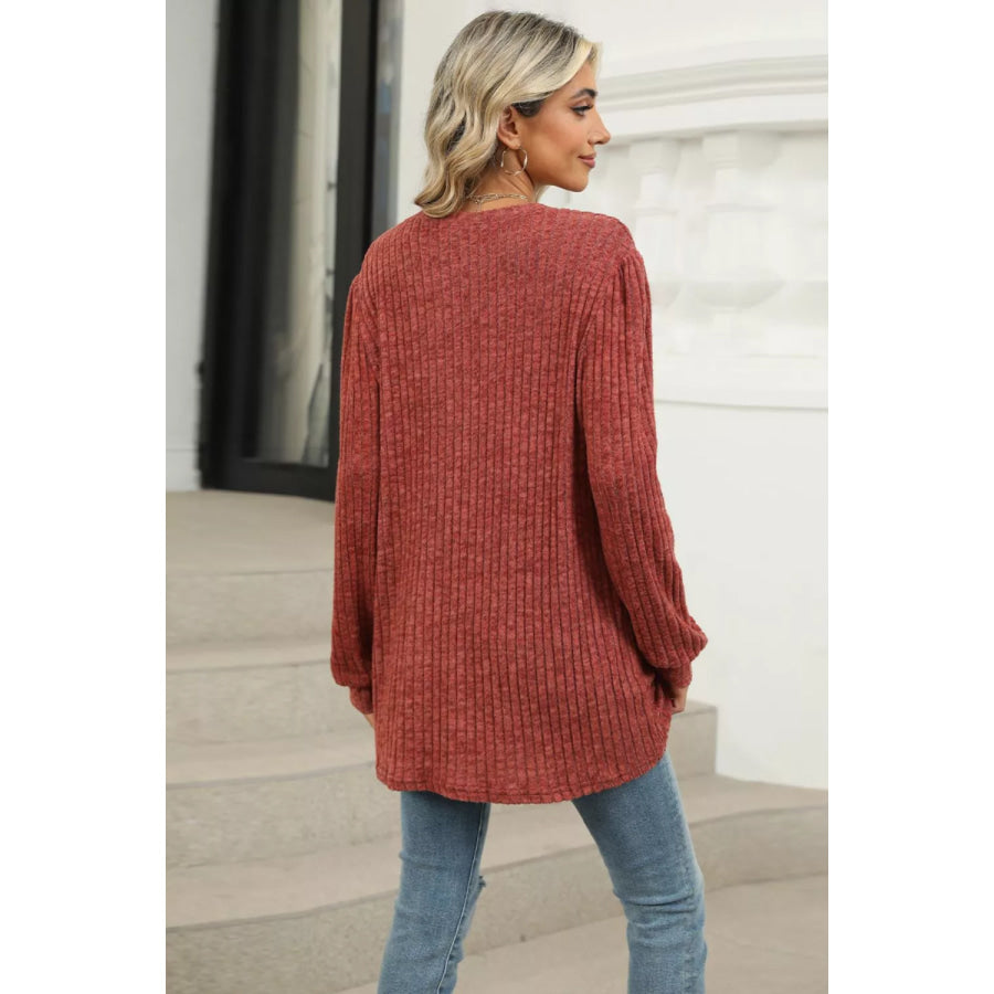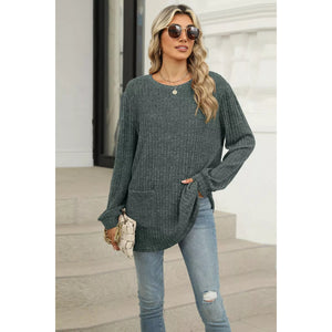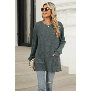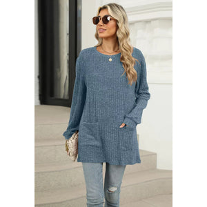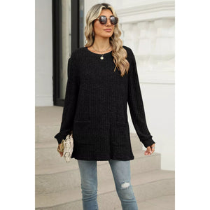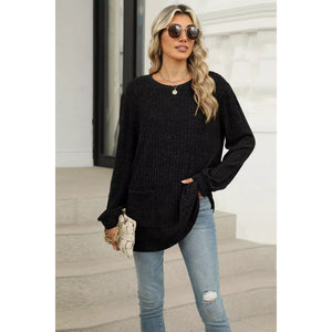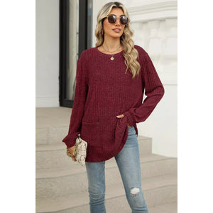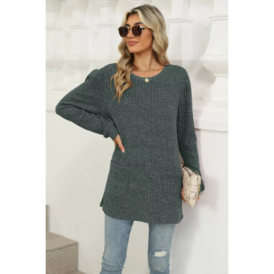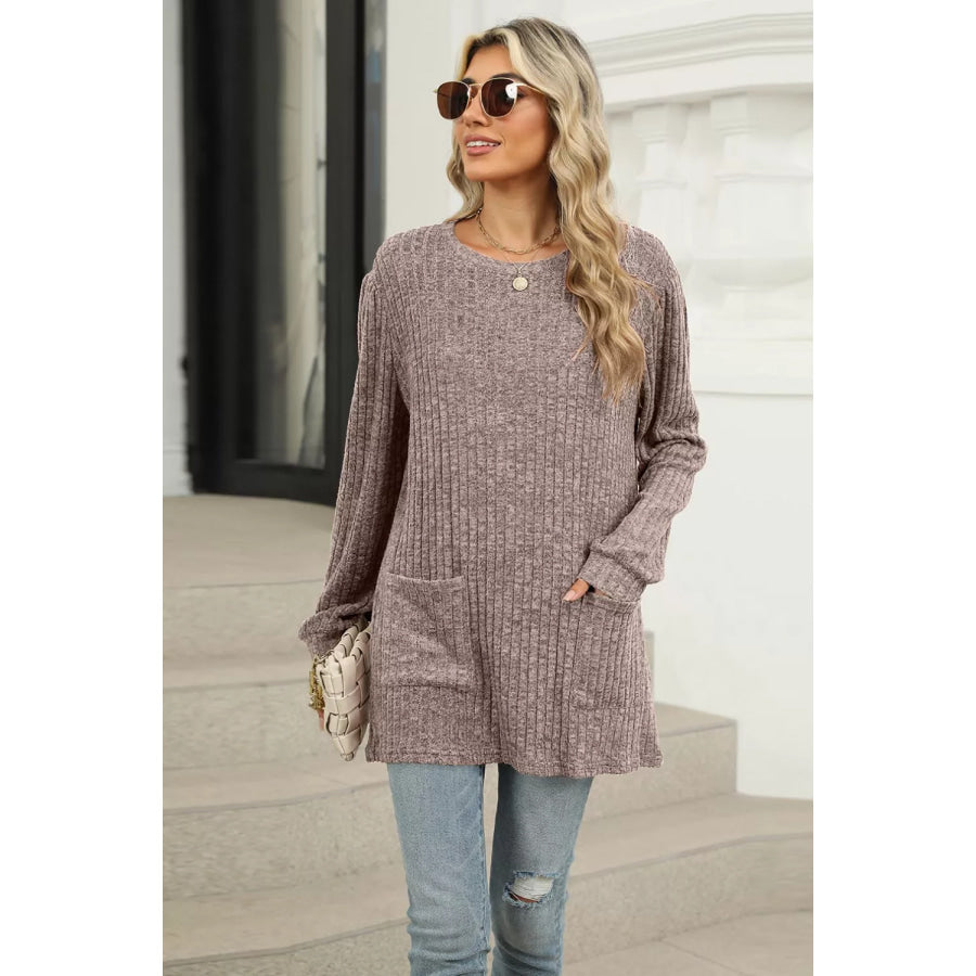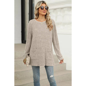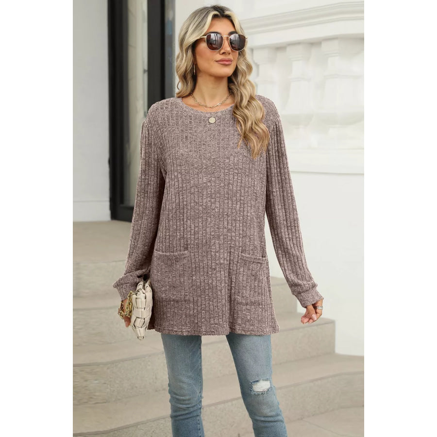Long Sleeve Ribbed Knit Top with Front Pockets