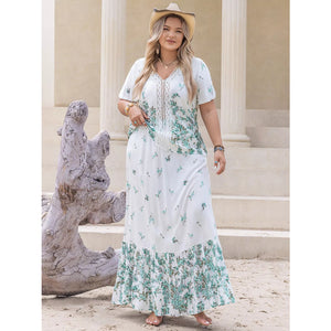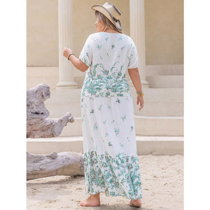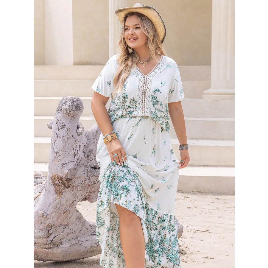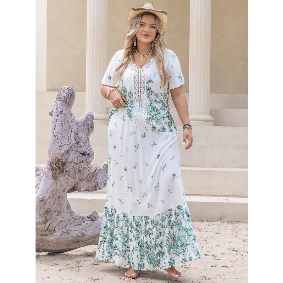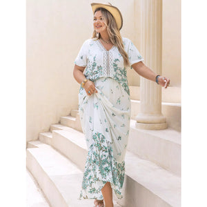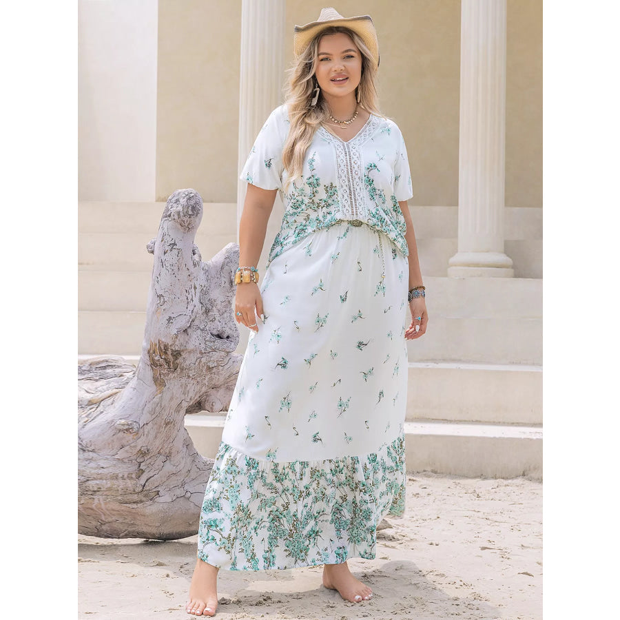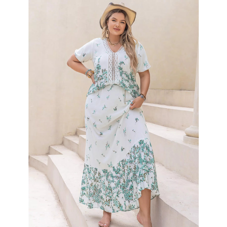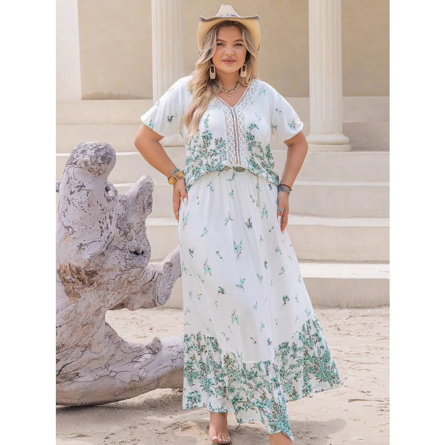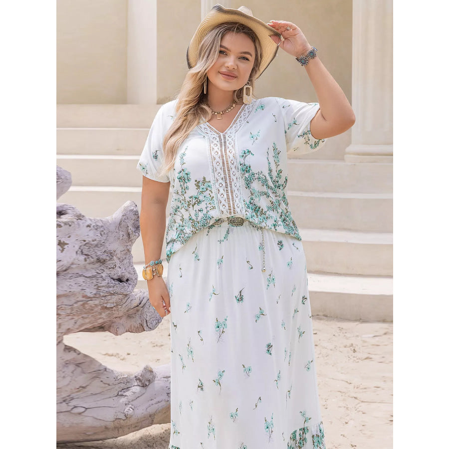 Plus Size Printed Lace Detail Short Sleeve Top and Skirt Set