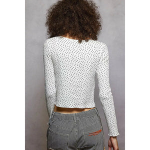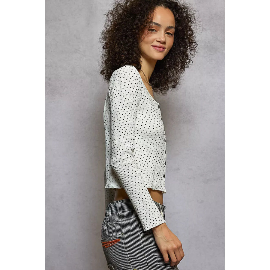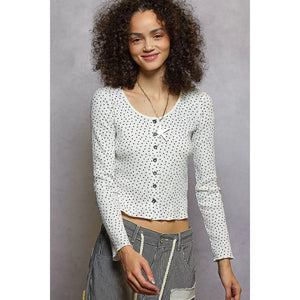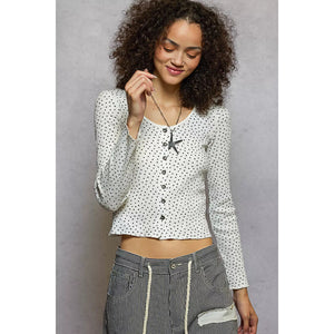 The button-down polka dot ribbed cardigan is a stylish and versatile addition to any wardrobe. With its classic polka dot pattern and cozy ribbed texture, it is perfect for layering during cooler weather. The button detailing adds a touch of sophistication, making it easy to dress up or down for any occasion. This cardigan is a great choice for adding a pop of pattern and texture to your outfit. Stay comfortable and chic in this trendy polka dot ribbed cardigan.