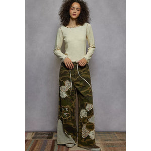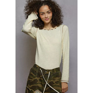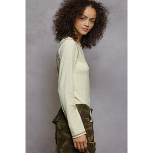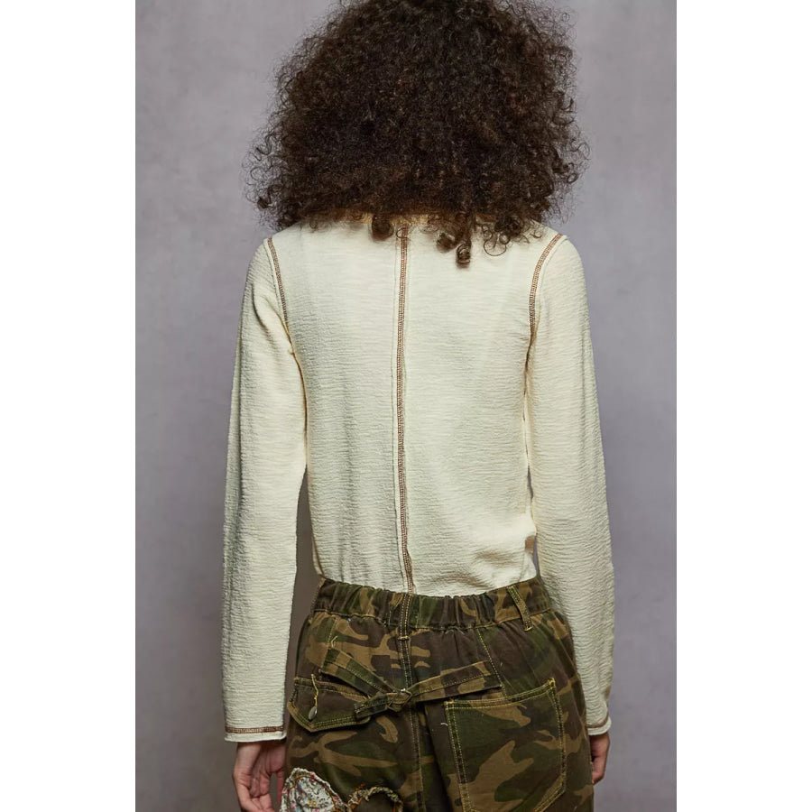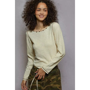 POL Round Neck Long Sleeve Contrast Stitching T-Shirt with Stud Detail