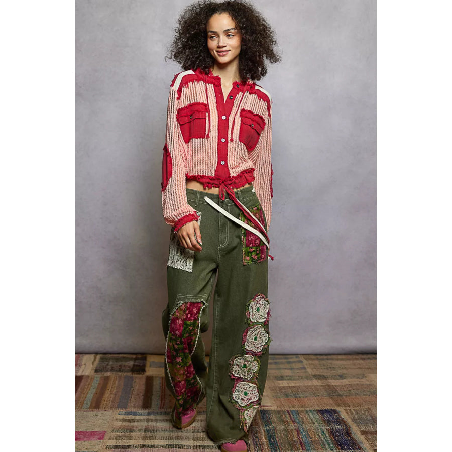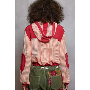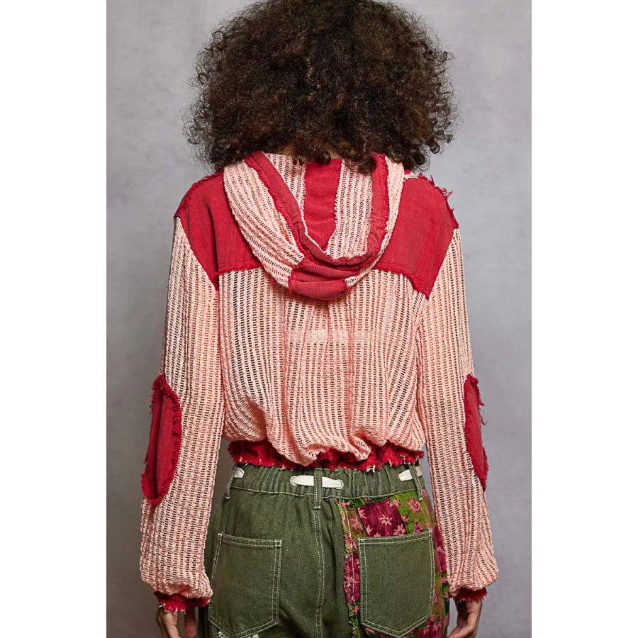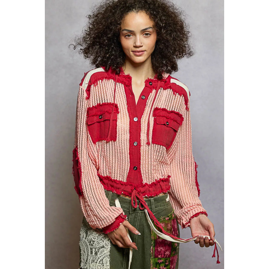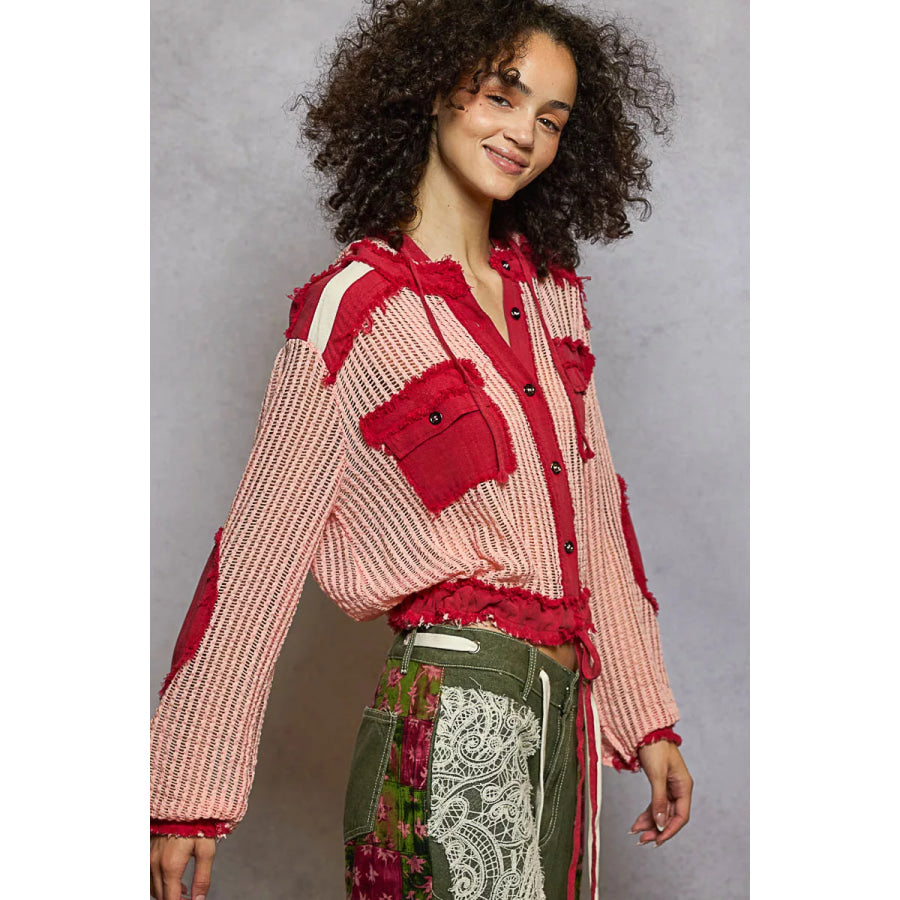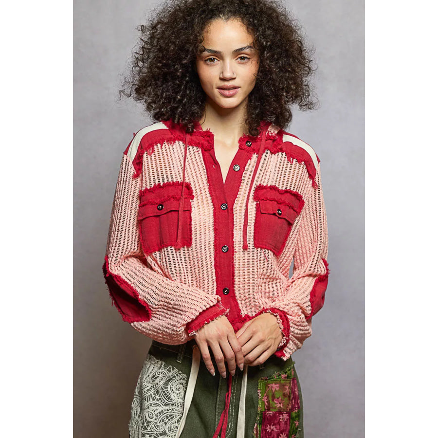 POL Texture Woven Button Down Hooded Shirt with Drawstring Hem