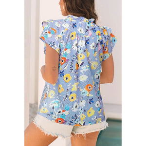 Printed Ruffle Cap Sleeve Notched Blouse