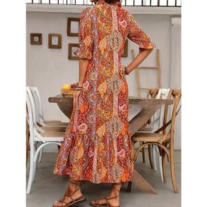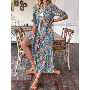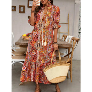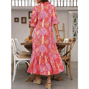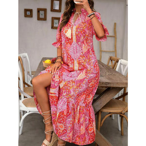 Printed Tie Neck Flounce Sleeve Midi Dress