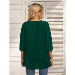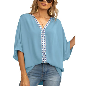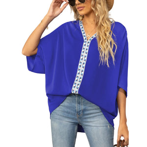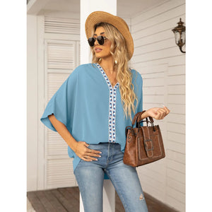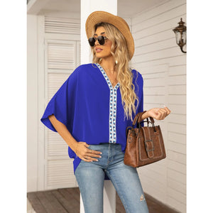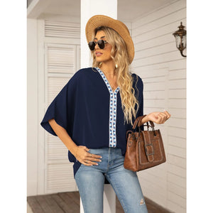 Printed Trim V-Neck Batwing Sleeve Blouse