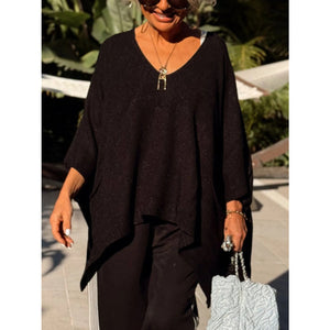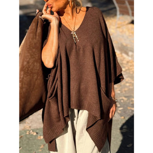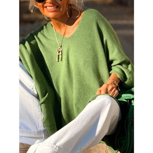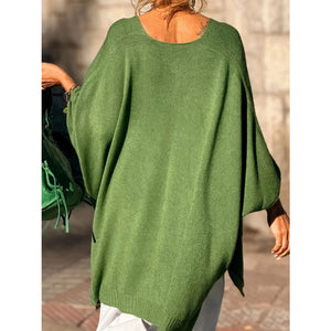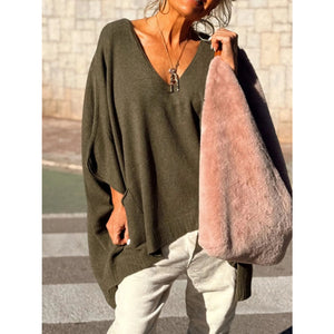 This stunning oversized ribbed hem V-neck sweater features a luxurious soft knit construction in a sophisticated olive green shade. The deep V-neckline creates an elegant and flattering silhouette, while the distinctive ribbed hem adds structural detail and modern appeal. The dramatic draped batwing sleeves provide a bohemian-chic aesthetic with comfortable loose fit perfect for layering. Crafted from premium knit material that offers excellent drape and breathability, this pullover sweater combines comfort with high-fashion styling. The asymmetrical hemline and side splits enhance movement while maintaining a contemporary edge, making it ideal for both casual and semi-formal occasions.