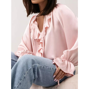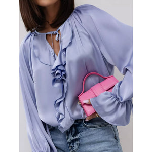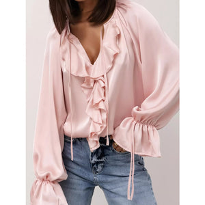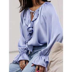 Ruffle Trim Satin Flounce Sleeve Blouse