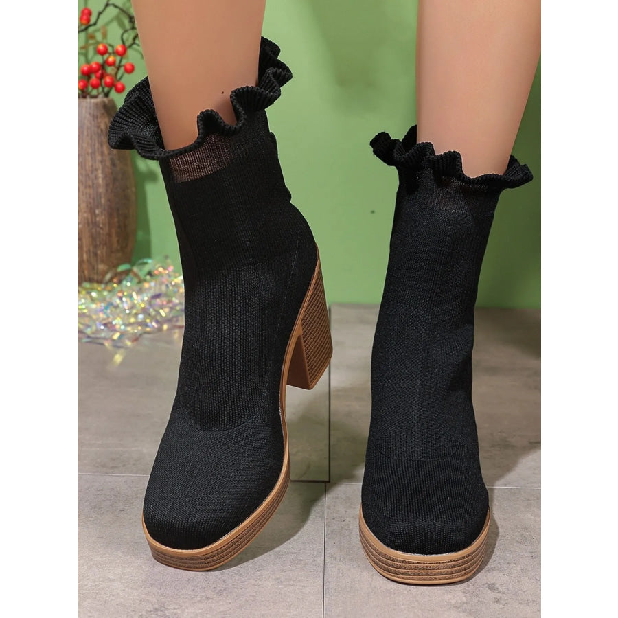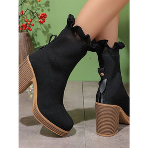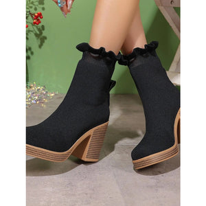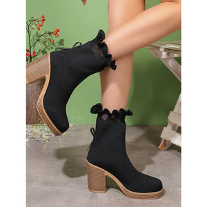 Ruffled Trim Chunky Heel Boots