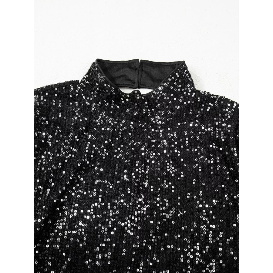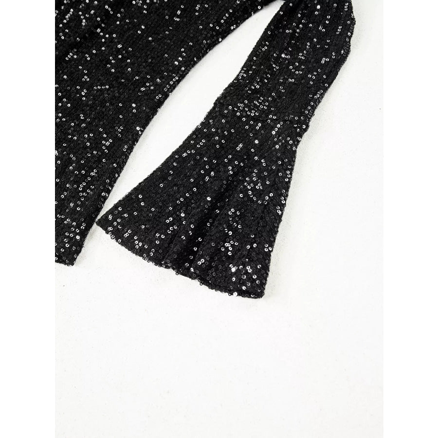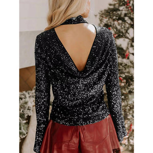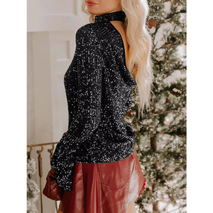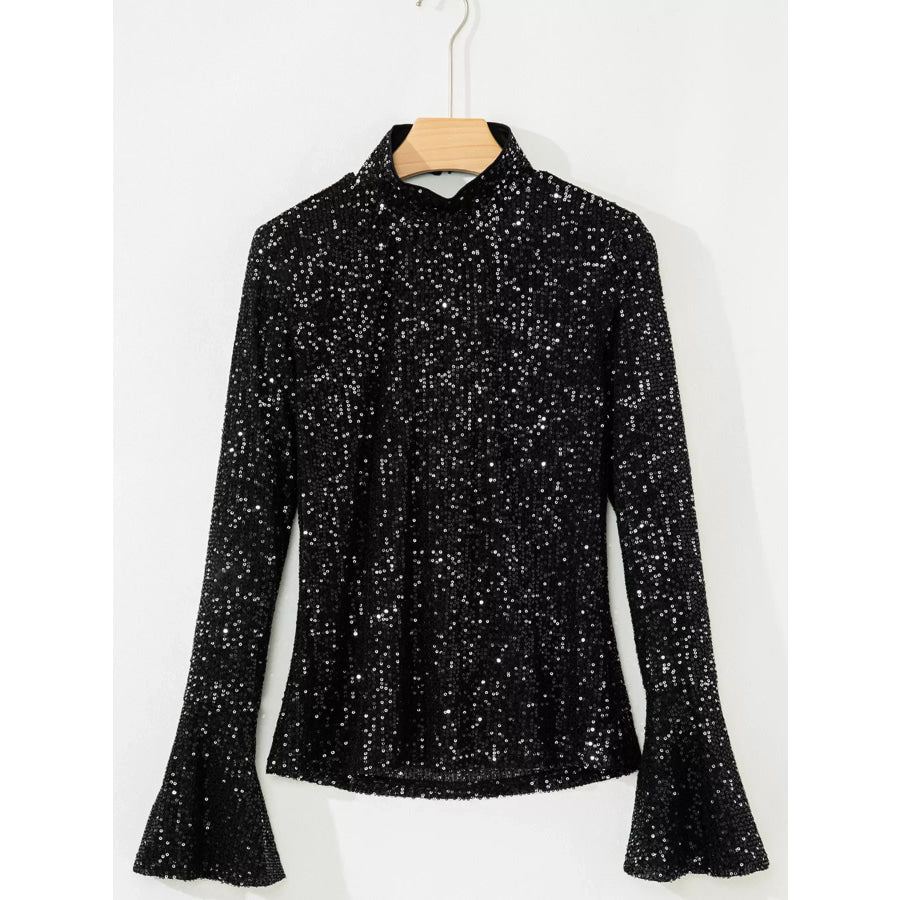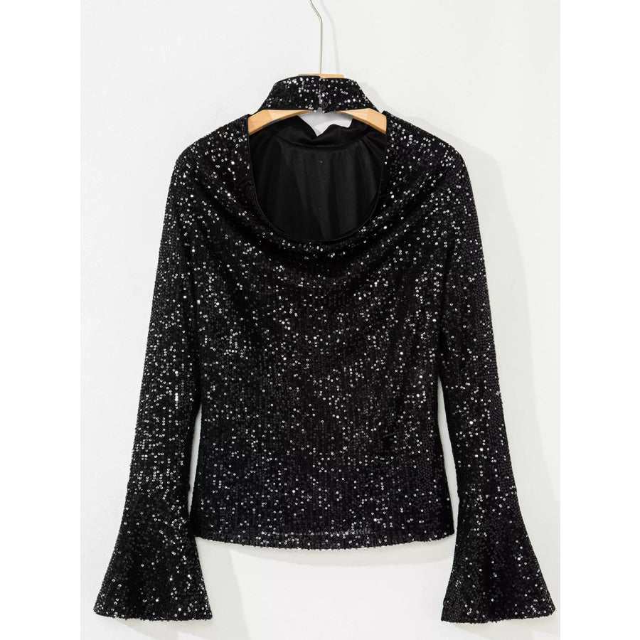 Sequin Mock Neck Drape Open Back Bell Sleeve Top
