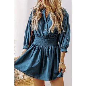 Smocked Half Button Three-Quarter Sleeve Mini Dress