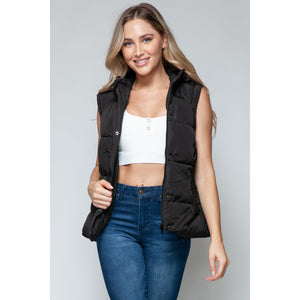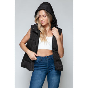 The hooded vest features both snap and zip closures, offering convenience and style. The combination of snap buttons and zippers allows for easy adjustments and secure closure. The hood adds an extra element of warmth and protection, making it a practical and stylish choice for various weather conditions.