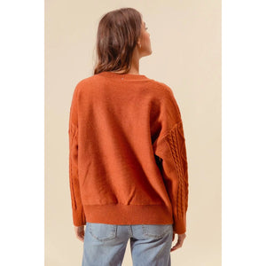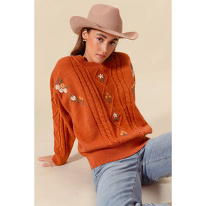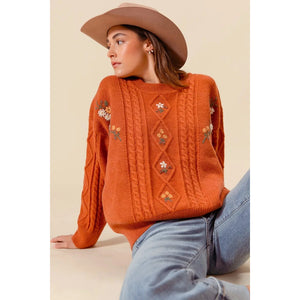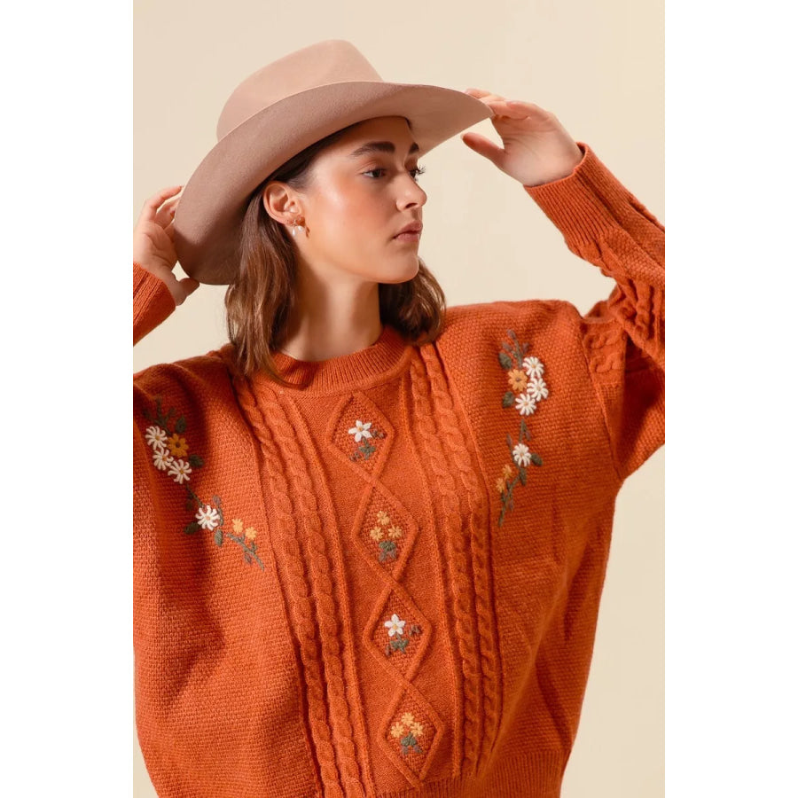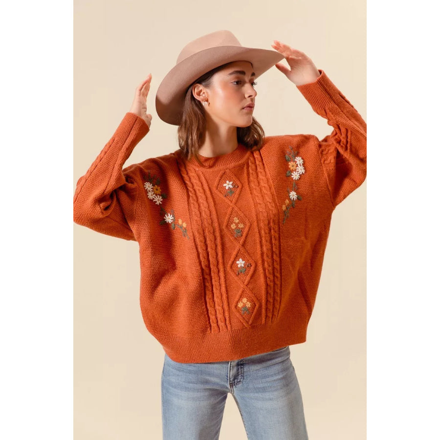 SO ME Embroidered Flower Cable Knitted Sweater