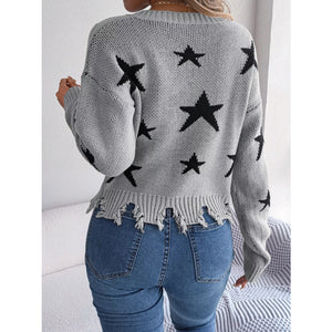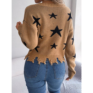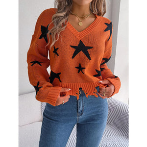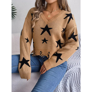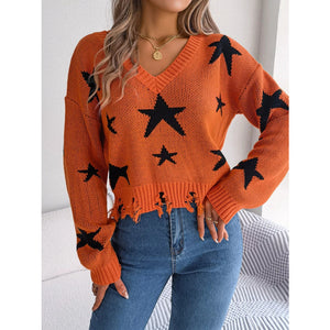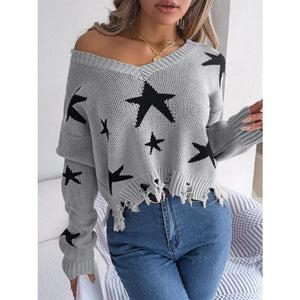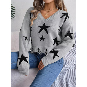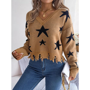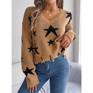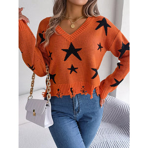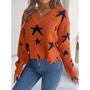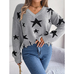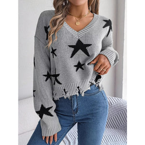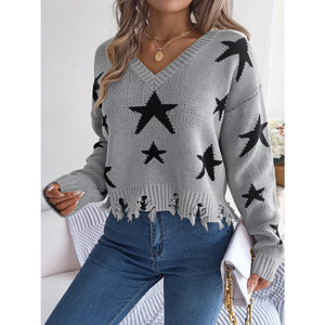 Star Pattern V-Neck Distressed Sweater