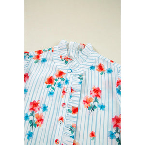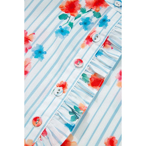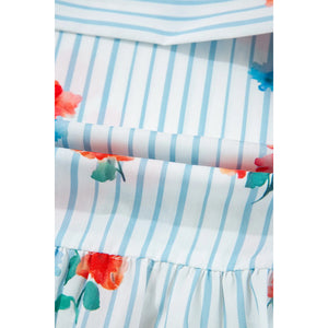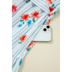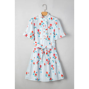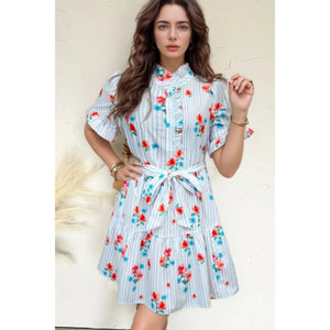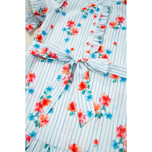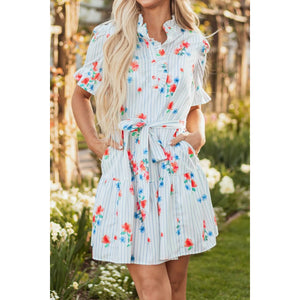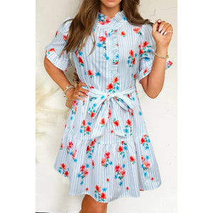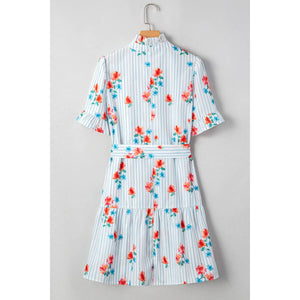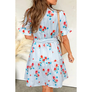 Stripe Floral Pattern Ruffle Short Sleeve Belted Mini Dress