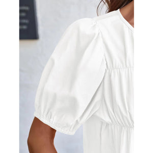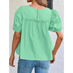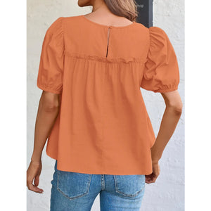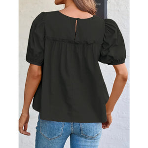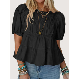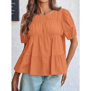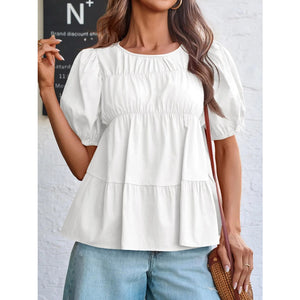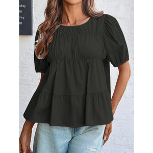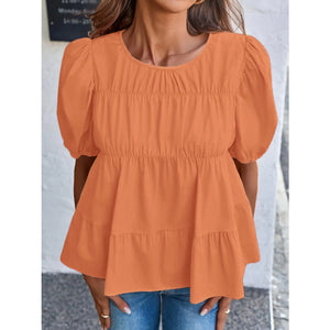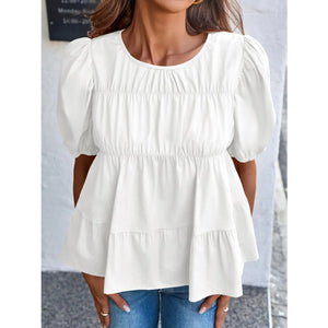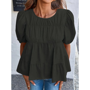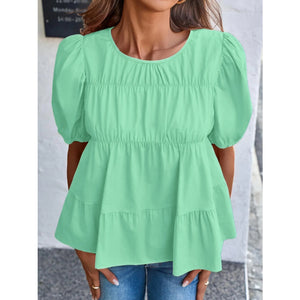 Tiered Round Neck Puff Sleeve Ruched Blouse