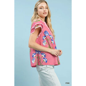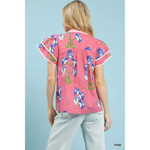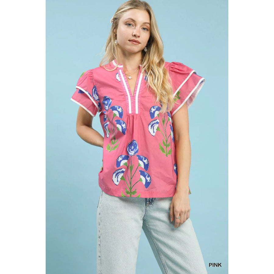Umgee Blossom Meadow Print Blouse with Contrast Trim