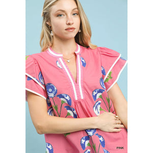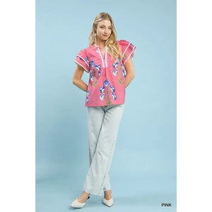 Umgee Blossom Meadow Print Blouse with Contrast Trim