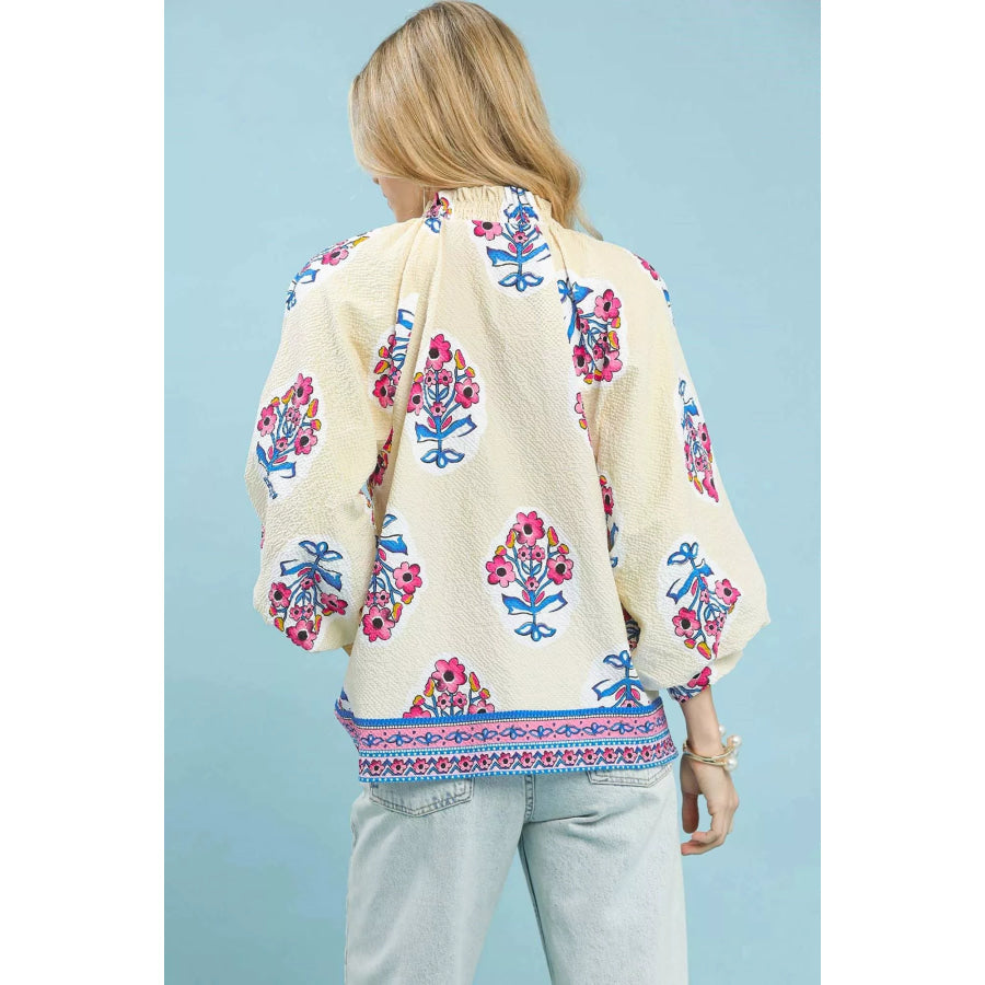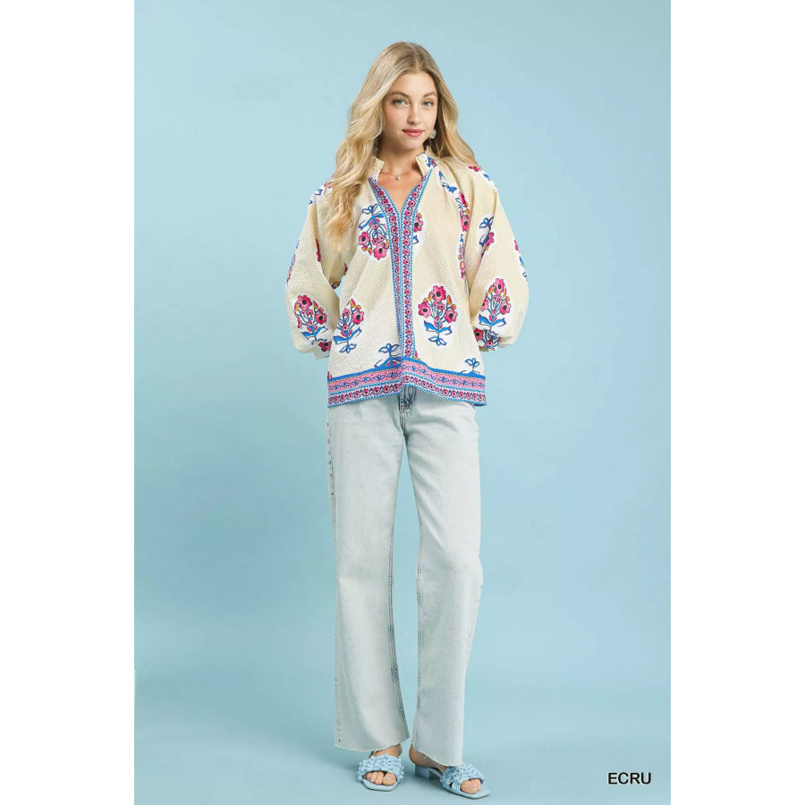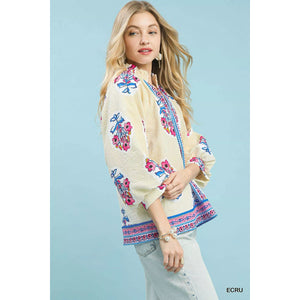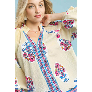 This Boho Floral Print Tunic Top showcases a charming split V-neck design that adds a bohemian flair to your look. The wide, flowy 3/4 sleeves provide comfort and a breezy feel. Its straight hem with a contrasting border print at the placket and bottom creates a visually appealing style. Perfect for casual outings, this top is not lined for a relaxed fit. Embrace boho chic vibes with this unique and stylish tunic top!