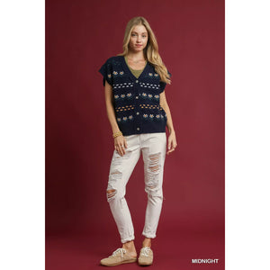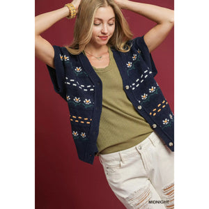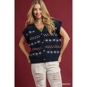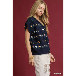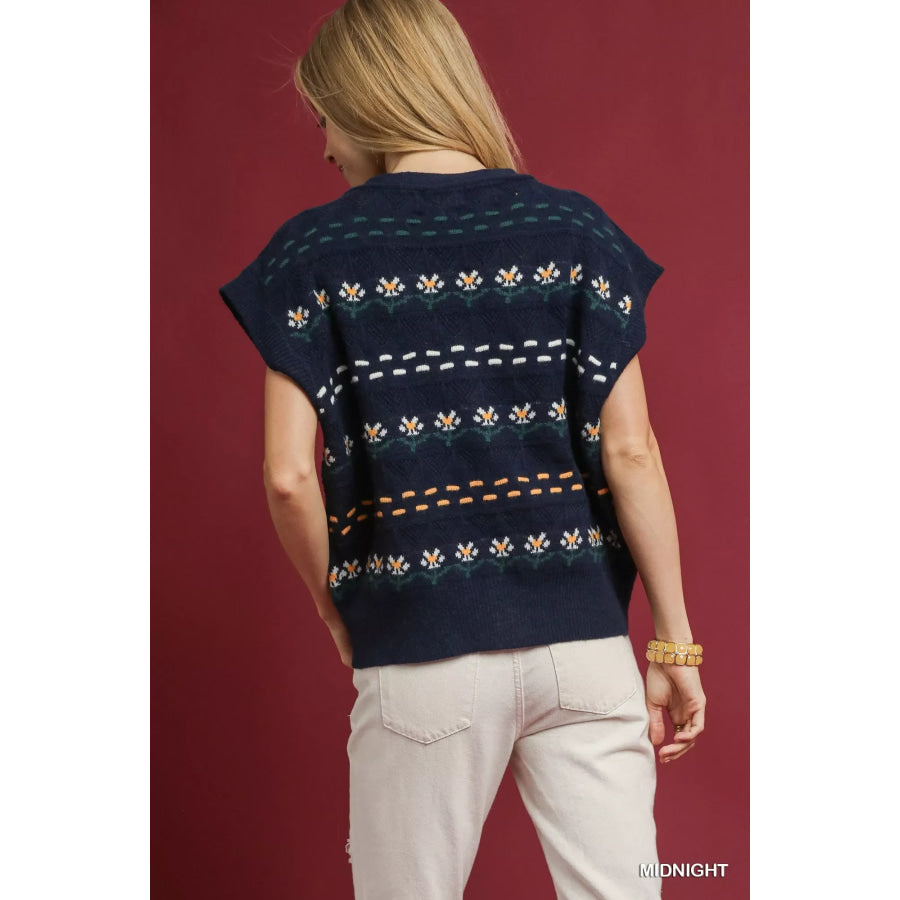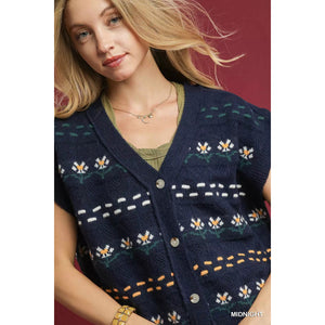 This button-down knit vest with a floral pattern features charming daisy motifs and stripe details for a whimsical look. The V-neckline adds a classic touch, while the front button-down style allows for easy wearing. With a sleeveless design and wide arm openings, this vest is both stylish and comfortable. Crafted from soft and cozy knit fabric, it's perfect for layering on cooler days. Please note that this vest is not lined, making it breathable and versatile for styling.