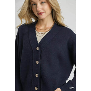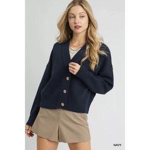 This button-front knit cardigan features a V-neck and a relaxed, slightly oversized silhouette that is both cozy and stylish. The ribbed hem and cuffs add a touch of texture to the design. Perfect for layering, this cardigan is ideal for adding a casual and comfortable touch to any outfit. It is not lined, making it an excellent choice for transitional weather. Stay warm and on-trend with this must-have wardrobe essential.