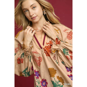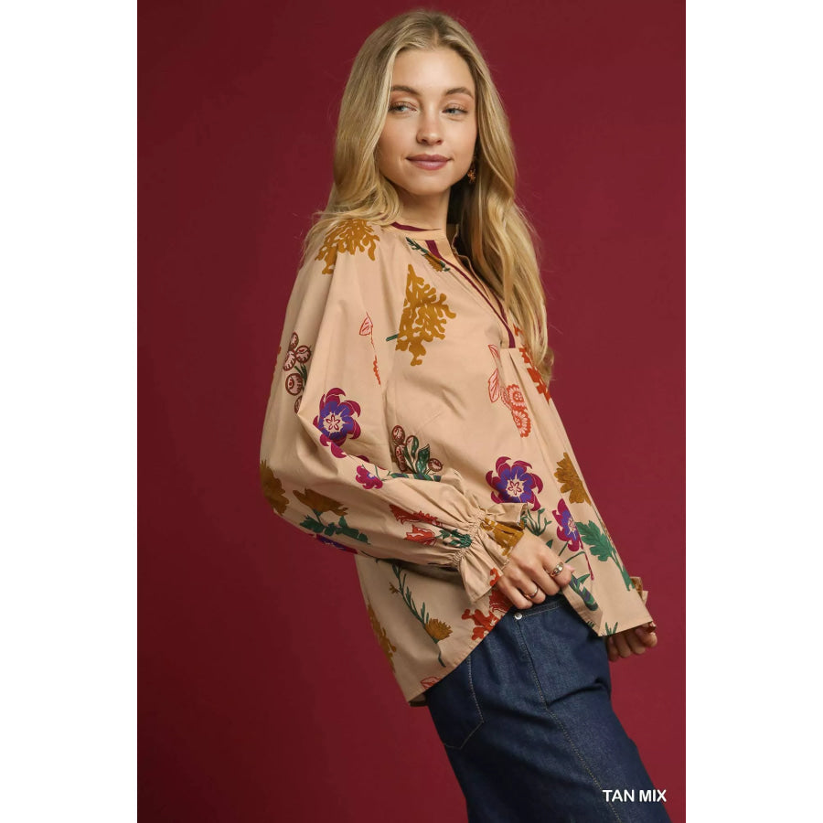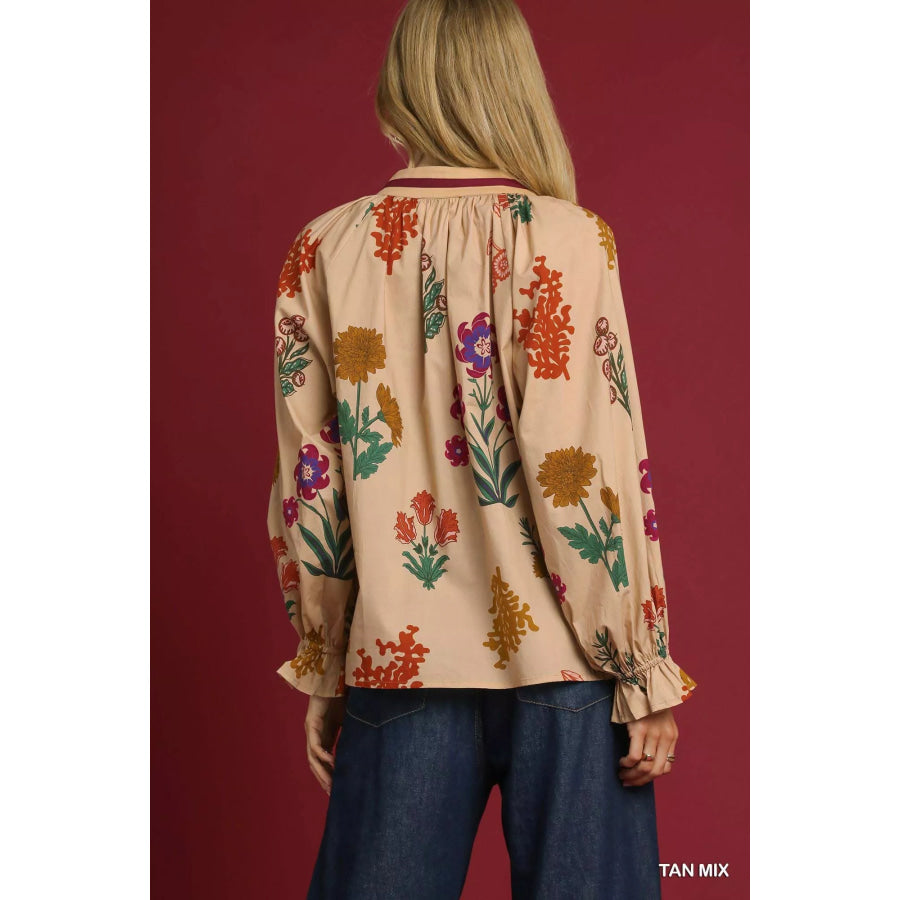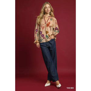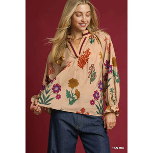 Umgee Floral Print Flounce Sleeve Blouse