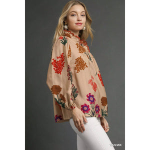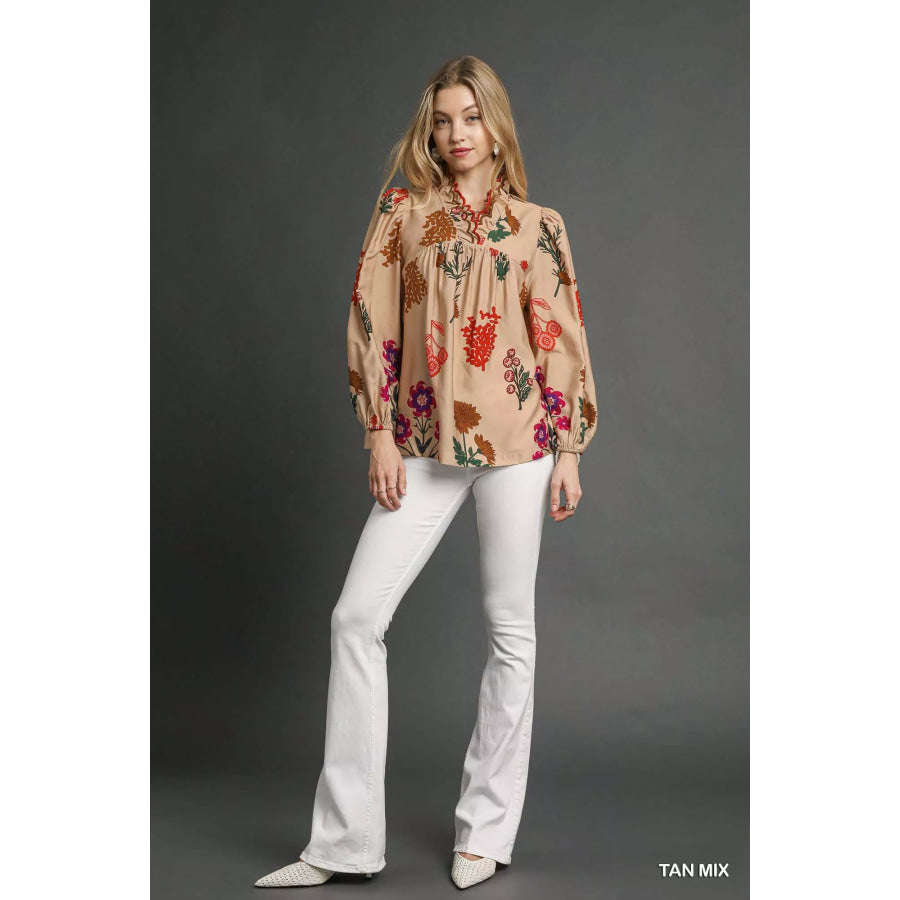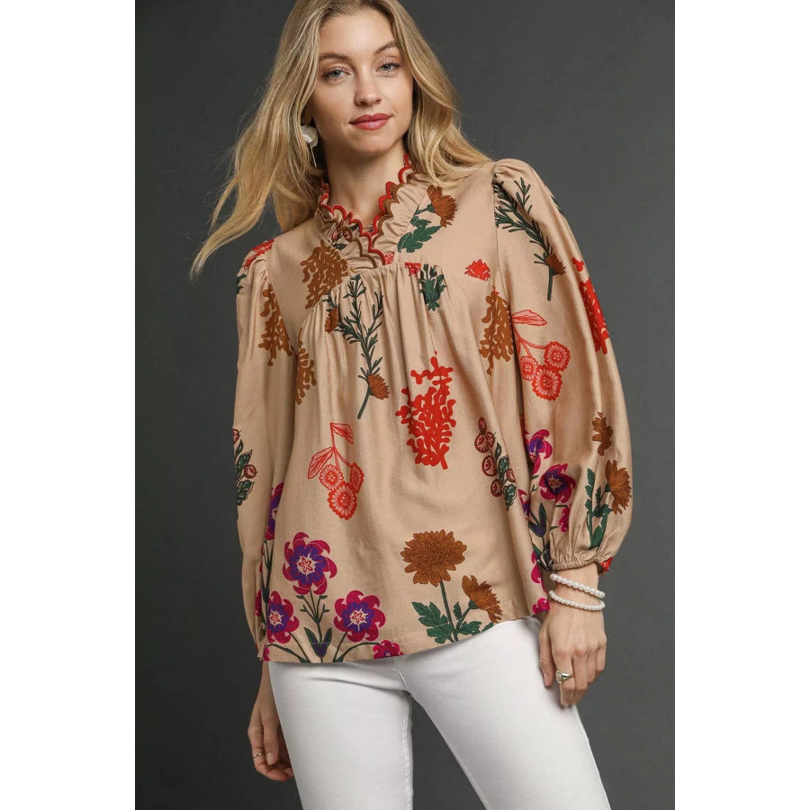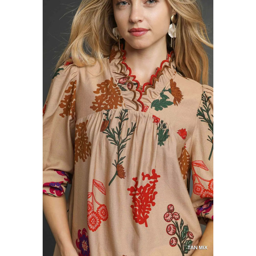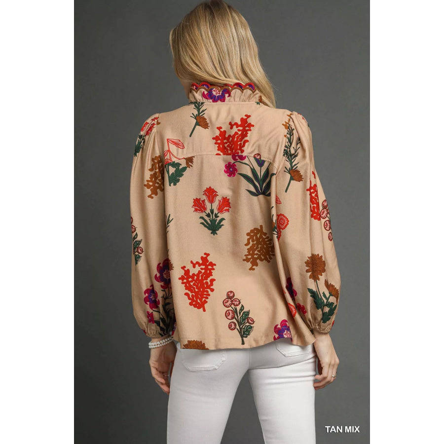 This flower print blouse top features a scalloped neckline with contrast trim, adding a touch of sophistication to the piece. The long sleeves come with elastic cuffs for a comfortable fit. The vibrant flower print adds a pop of color and personality to the overall look. Please note that this blouse top is not lined, providing a lightweight feel for all-day wear. Perfect for adding a feminine touch to your everyday wardrobe.