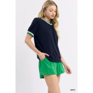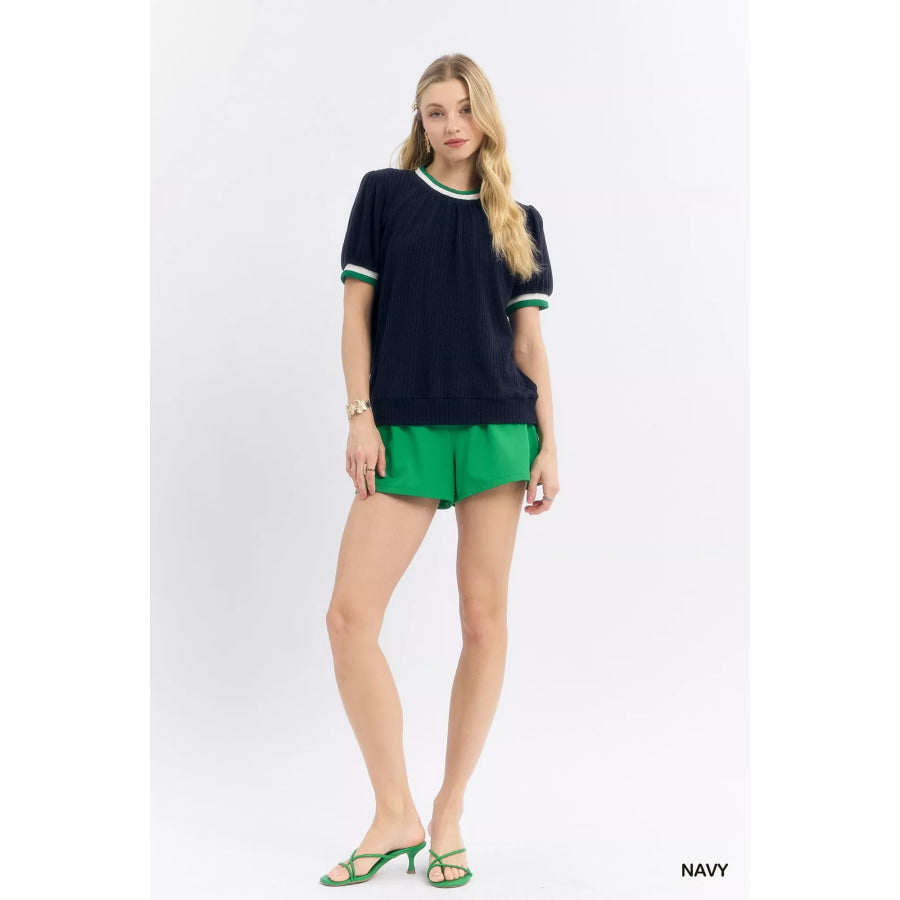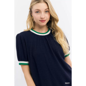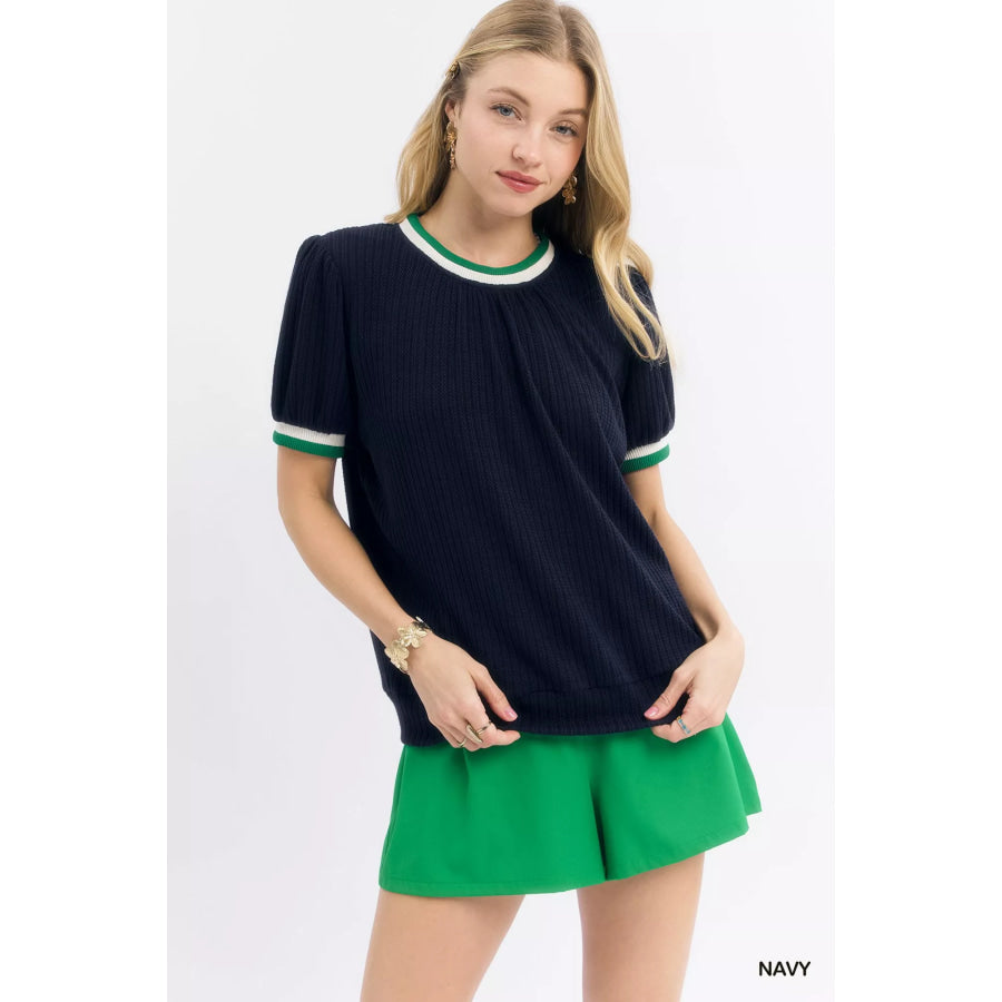 Umgee Puff Sleeve Knit Top with Contrast Rib Trim