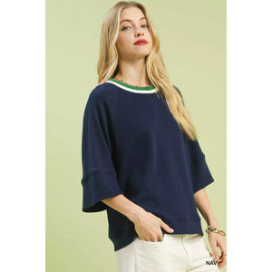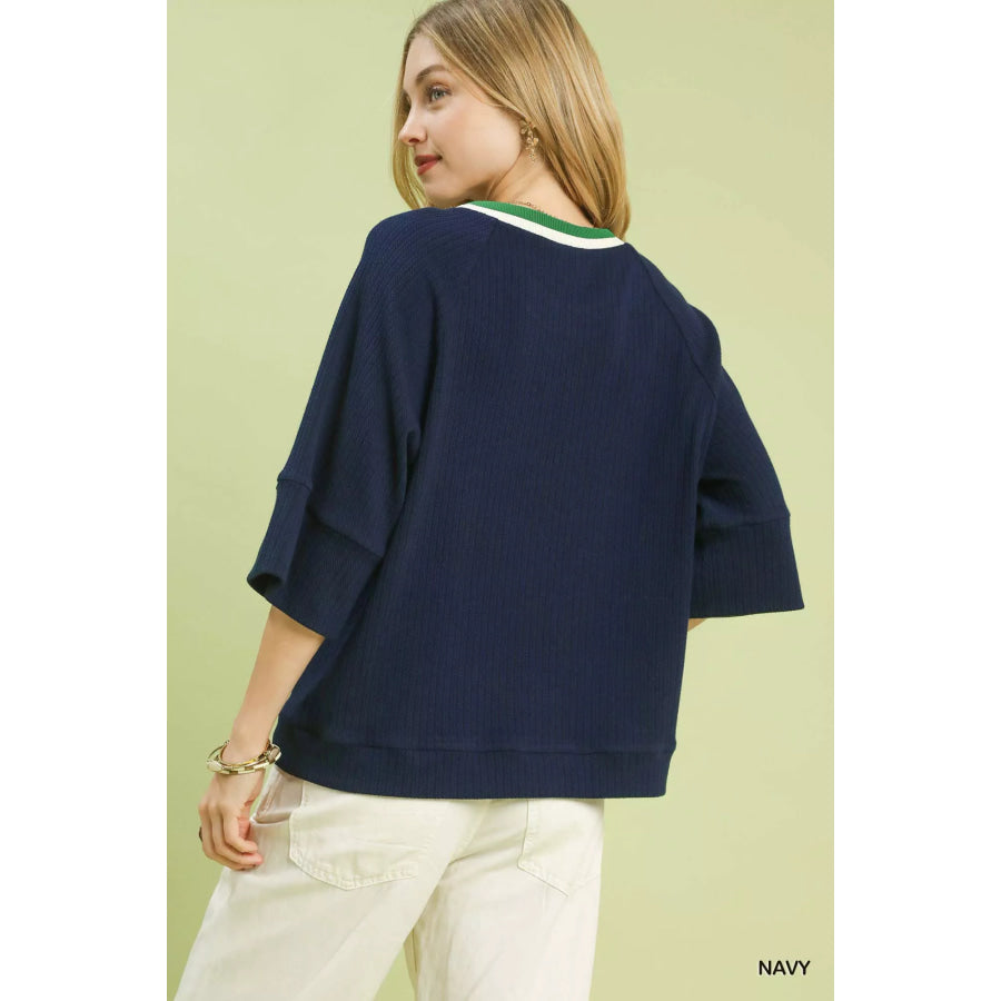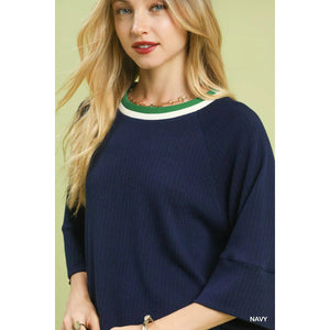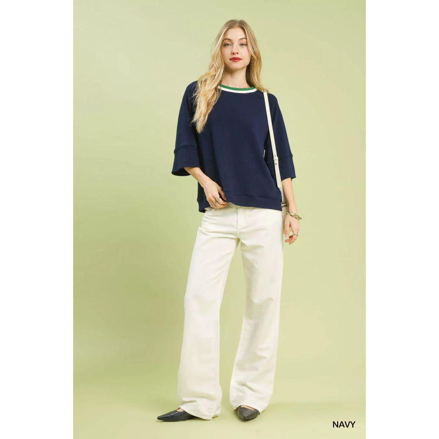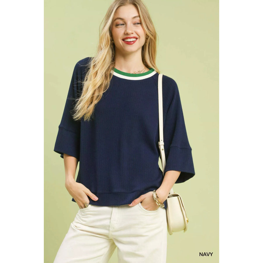 Elevate your everyday style with this Ribbed Knit Top. The soft ribbed knit blend offers both comfort and style. It features a classic crew neckline with a contrast trim detail for a stylish touch. The half-length wide sleeves give a modern and laid-back look. This top is not lined, making it perfect for layering or wearing on its own.