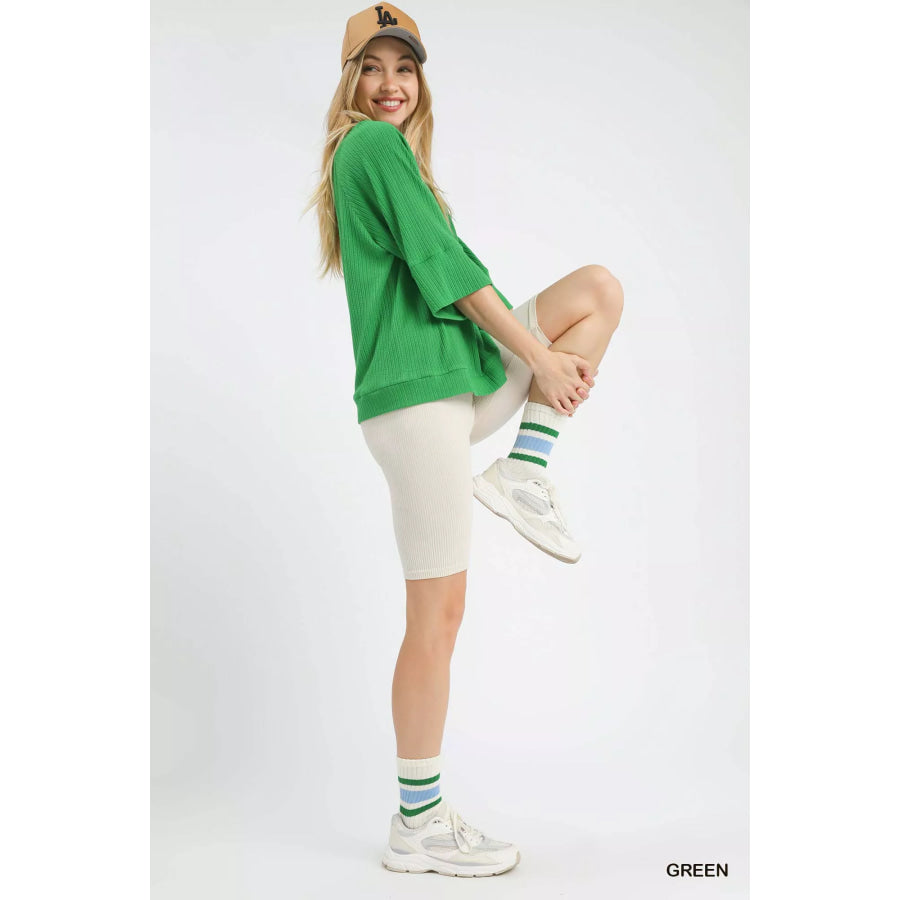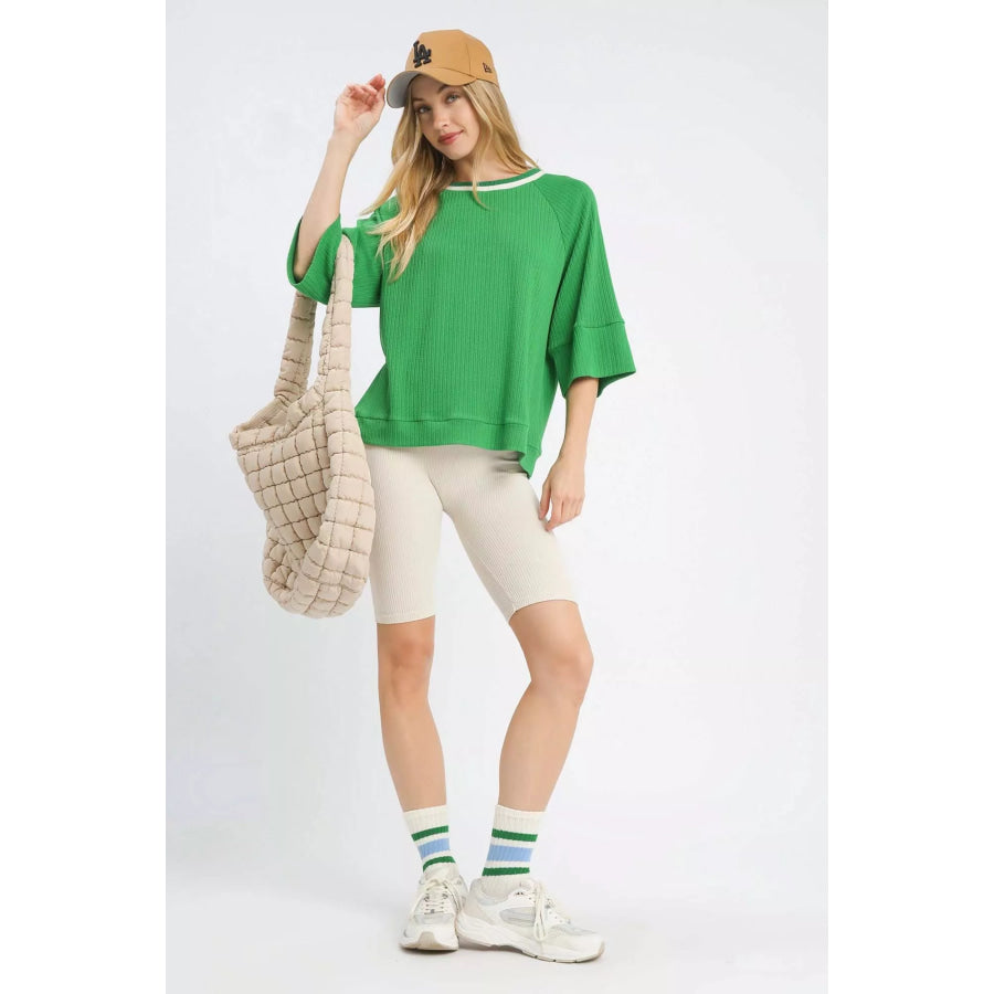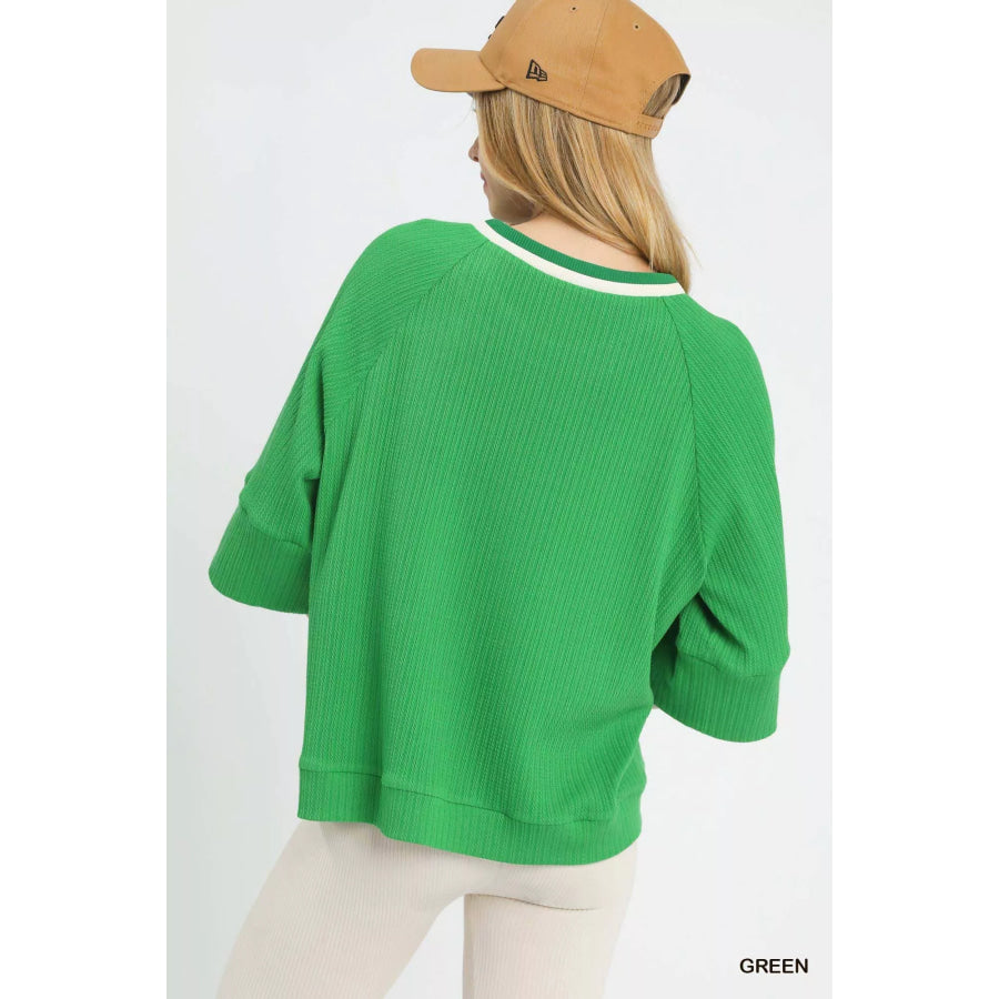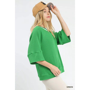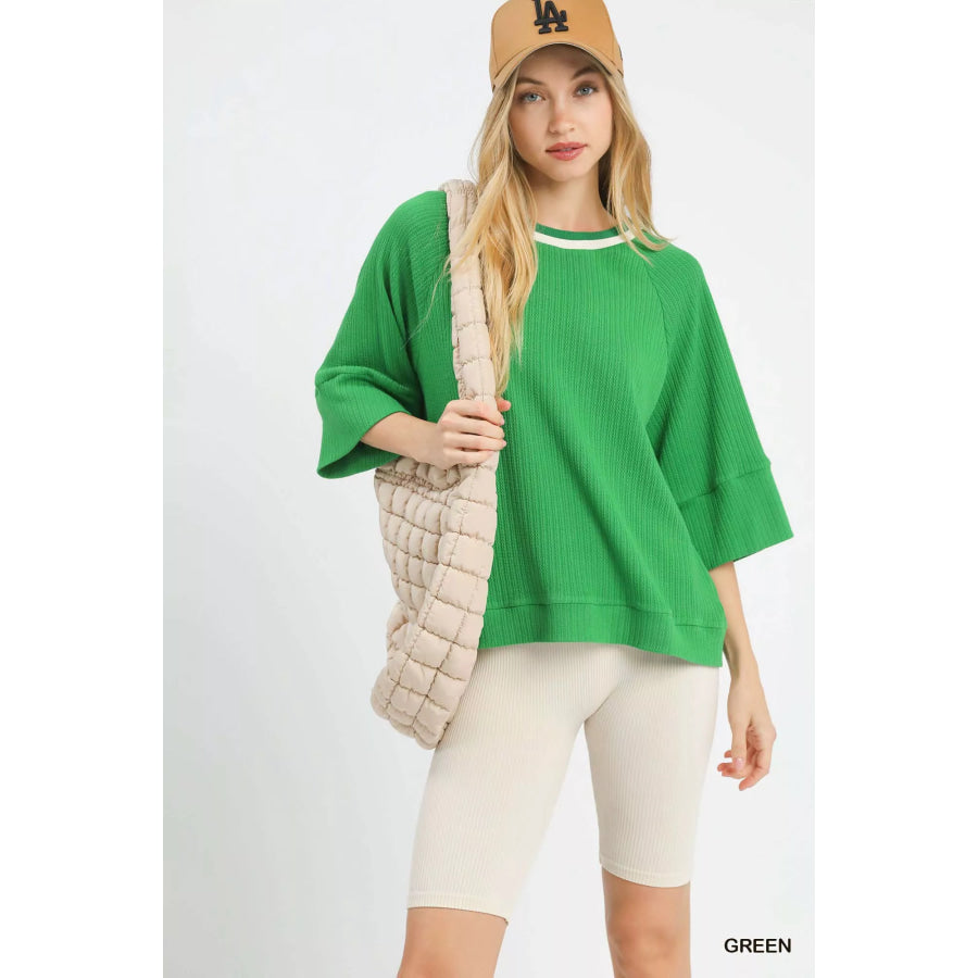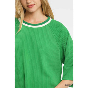 Elevate your everyday style with this Ribbed Knit Top. The soft ribbed knit blend offers both comfort and style. It features a classic crew neckline with a contrast trim detail for a stylish touch. The half-length wide sleeves give a modern and laid-back look. This top is not lined, making it perfect for layering or wearing on its own.