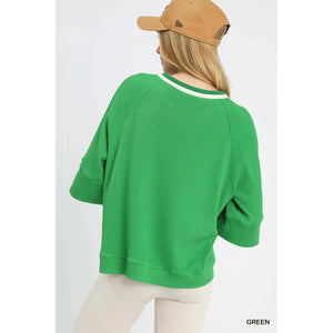 Elevate your everyday style with this Ribbed Knit Top. The soft ribbed knit blend offers both comfort and style. It features a classic crew neckline with a contrast trim detail for a stylish touch. The half-length wide sleeves give a modern and laid-back look. This top is not lined, making it perfect for layering or wearing on its own.