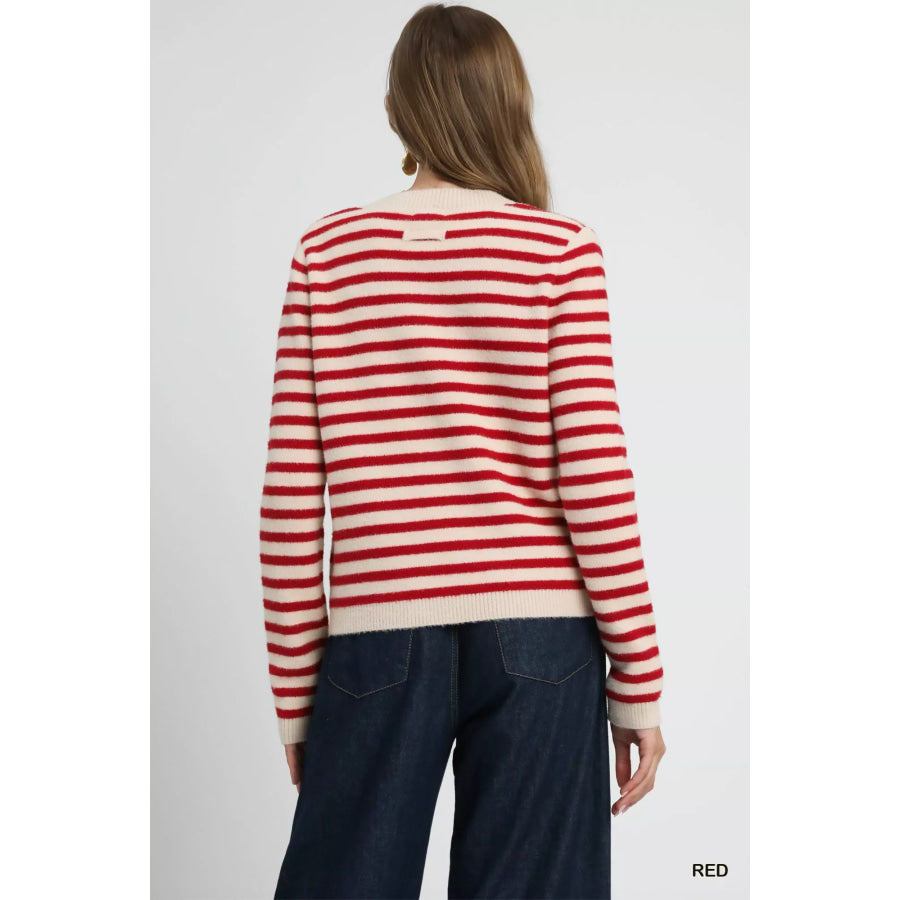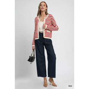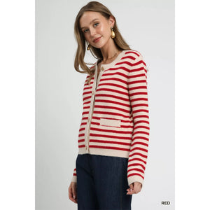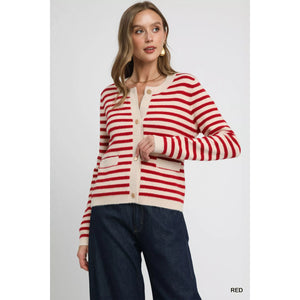 Stay cozy and stylish in this Striped Knit Button-Up Cardigan. The soft and comfy knit texture will keep you warm. It features two convenient front pockets for keeping your essentials handy. The long sleeves with ribbed cuffs add a classic touch. The button-up front with gold-toned snaps gives it a chic and trendy look.