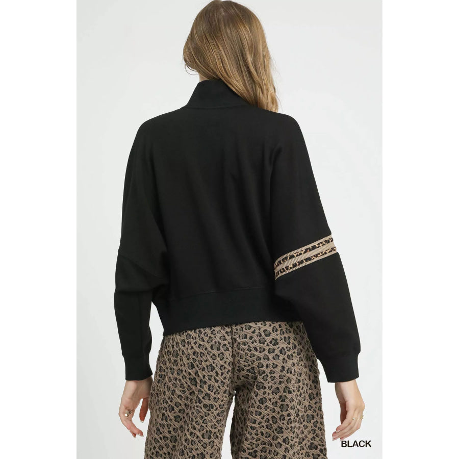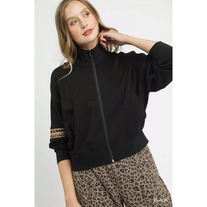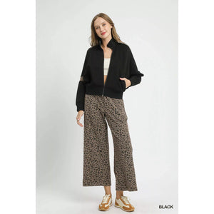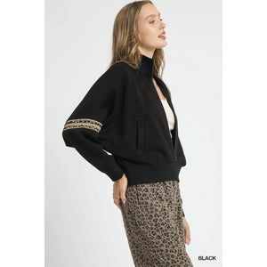 Umgee Zipper Up Cropped Jacket with Leopard Trim