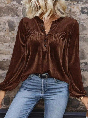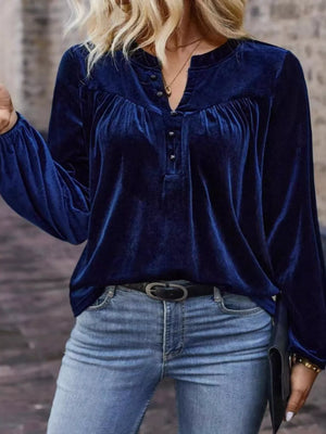 This Velvet Notched Long Sleeve Blouse is a stylish and sophisticated addition to any wardrobe. Made from luxurious velvet, it offers a soft and comfortable feel against the skin. The notched neckline adds a touch of elegance, while the long sleeves provide coverage and warmth. The button-down design allows for versatile styling options, making it suitable for both casual and formal occasions. The blouse is crafted from high-quality materials, ensuring durability and long-lasting wear. Perfect for layering or wearing on its own, this blouse is a must-have for any fashion-conscious individual.