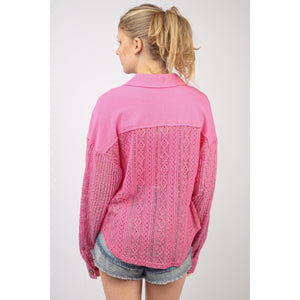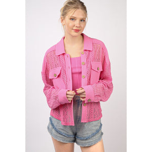 This Lace Shirt features a drop shoulder design and long sleeves, creating a relaxed and casual look. The button-up style adds a touch of sophistication. The addition of patch pockets and contrast fabrics gives the shirt a unique and eye-catching detail. The bright colors make it a statement piece that can be worn as outerwear to add a pop of color to any outfit. This lace shirt is a versatile and stylish addition to your wardrobe, perfect for adding a fun and vibrant element to your look.