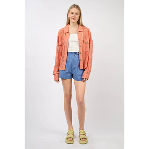 This Lace Shirt features a drop shoulder design and long sleeves, creating a relaxed and casual look. The button-up style adds a touch of sophistication. The addition of patch pockets and contrast fabrics gives the shirt a unique and eye-catching detail. The bright colors make it a statement piece that can be worn as outerwear to add a pop of color to any outfit. This lace shirt is a versatile and stylish addition to your wardrobe, perfect for adding a fun and vibrant element to your look.