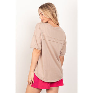 Complete your 90s-inspired wardrobe with this essential twisted sleeve band Henley knit top featuring a round neck and relaxed fit. The drop shoulder design adds a touch of laid-back style, while the button-up front and patch pocket provide a classic and versatile look. This short-sleeve top is perfect for everyday wear and can be easily paired with your favorite bottoms for a casual and cool outfit. The round hem adds a modern twist to this key item for 90's fashion, making it a must-have essential activewear top for your collection.