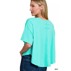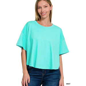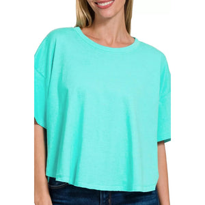 This mint green cropped t-shirt features a relaxed oversized fit perfect for casual everyday wear. Made from soft comfortable cotton blend fabric that offers breathability and easy care. The cropped length design creates a modern fashion silhouette that pairs perfectly with high-waisted bottoms. The round neckline and short sleeves provide classic comfort while the mint green color adds a fresh pop to any wardrobe. Ideal for layering or wearing alone, this versatile piece offers effortless style for spring and summer seasons.