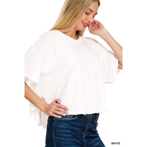 This stylish white T-shirt features distinctive ruffled sleeves that add a feminine touch to casual wear. Made from soft, comfortable fabric with excellent breathability and durability. The relaxed fit design ensures all-day comfort while the elegant ruffled sleeve details create a fashionable statement. Perfect for pairing with jeans, skirts, or shorts for versatile styling options. The classic white color makes it a wardrobe essential that complements any outfit. Ideal for casual outings, work, or weekend activities.