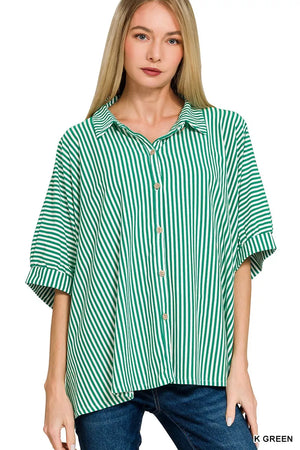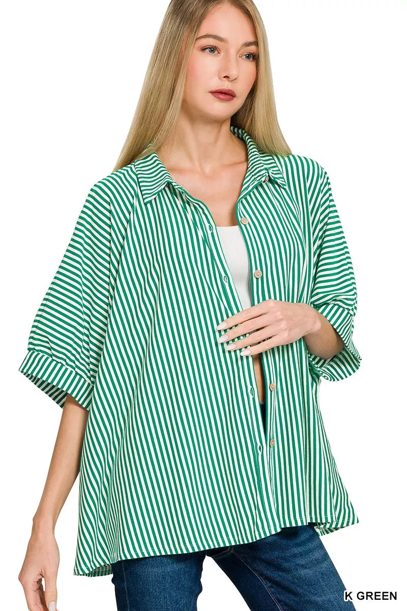The Oversized Stripe Button Down Shirt is a chic and trendy wardrobe staple. Featuring a classic stripe pattern, this shirt offers a timeless and versatile look. The oversized fit adds a modern twist, providing both comfort and style. With its button-down design, this shirt can be easily dressed up or down for various occasions. Made from high-quality materials, this shirt ensures durability and a flattering drape.