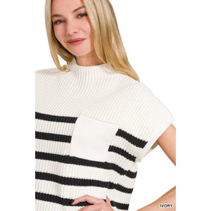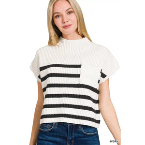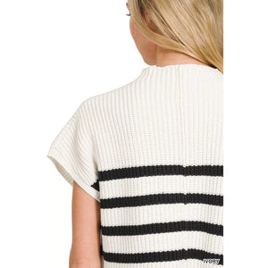 This short sleeve stripe sweater combines classic stripes with a modern silhouette for a timeless yet trendy look. The short sleeves make it perfect for transitional weather or layering. Crafted from a comfortable knit fabric, this sweater offers both style and comfort. The stripes add a touch of sophistication and versatility to the piece. Elevate your wardrobe with this chic and stylish short sleeve sweater that is perfect for various occasions.