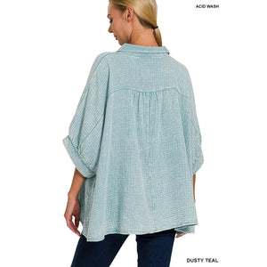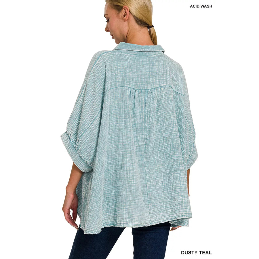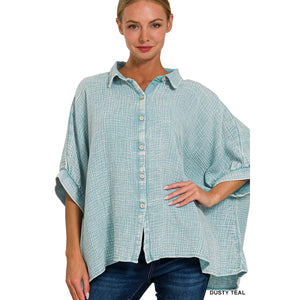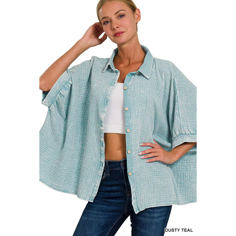 Zenana Washed Double Gauze Button Down Half Sleeve Shirt