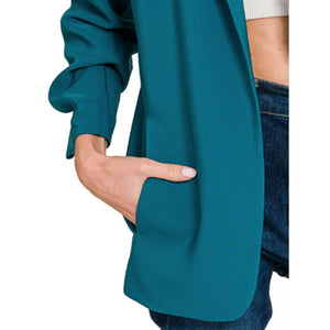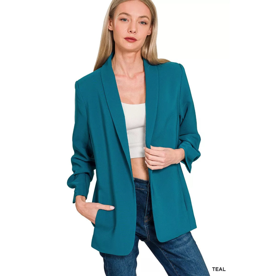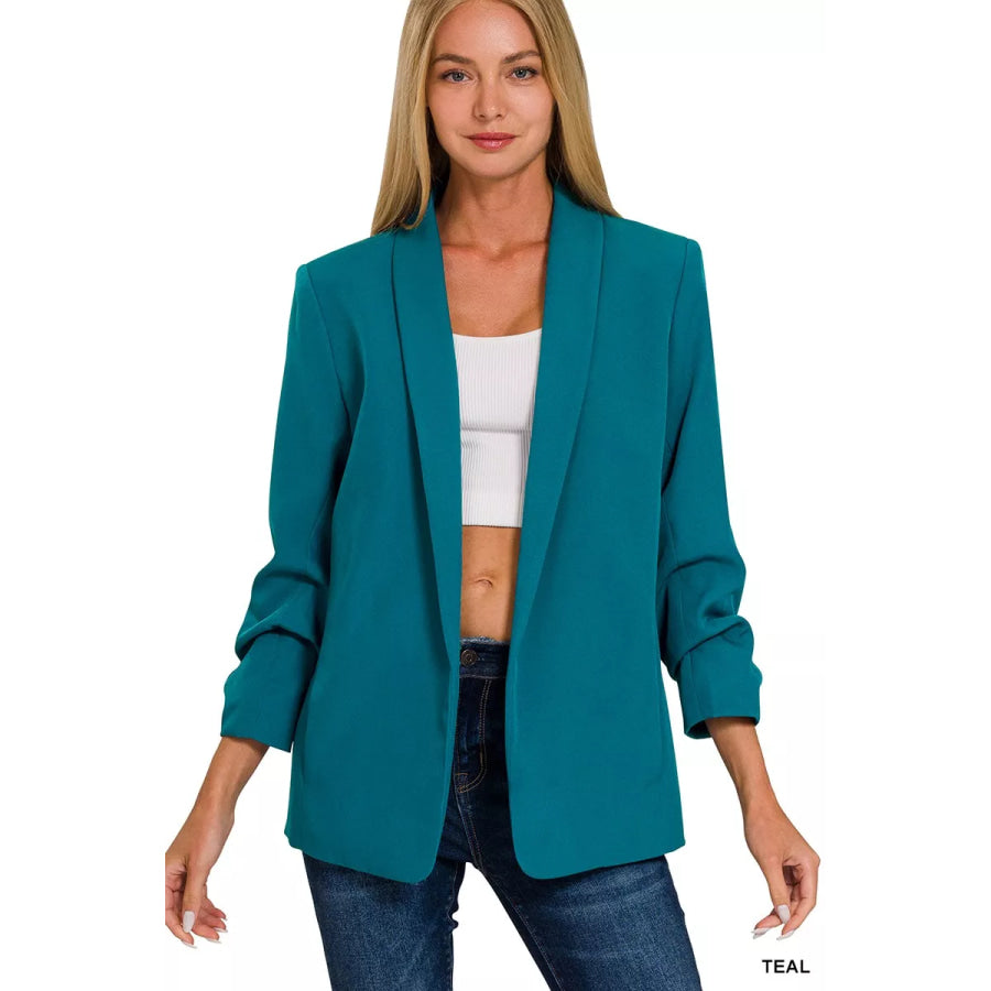 Zenana Woven 3/4 Ruched Sleeve Open Front Classic Blazer
